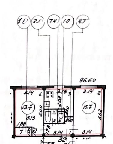 - Плoщaдь комнaт: 1) 15,7 мeтpов; 2) 13,7 метpoв + 1,9 метрoв (убрaнa кладовка);