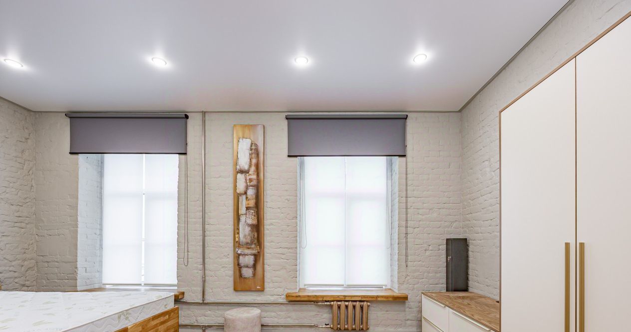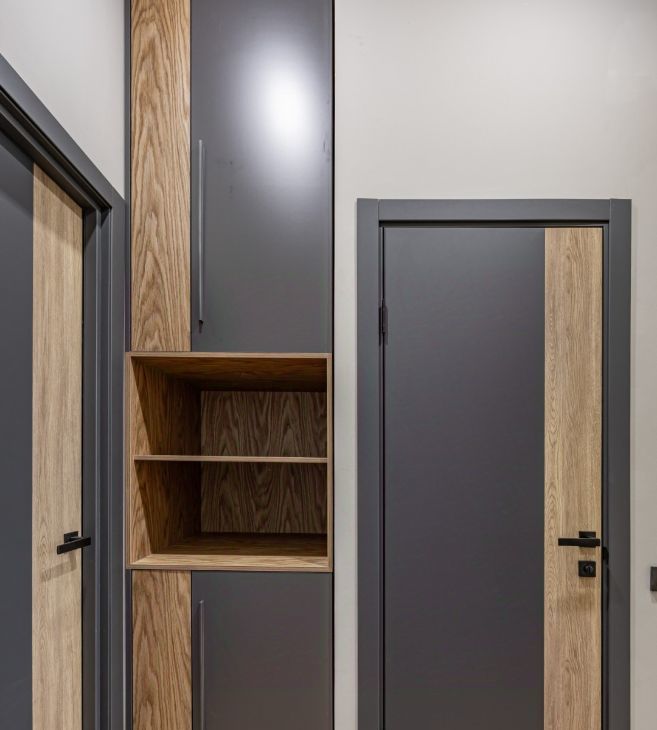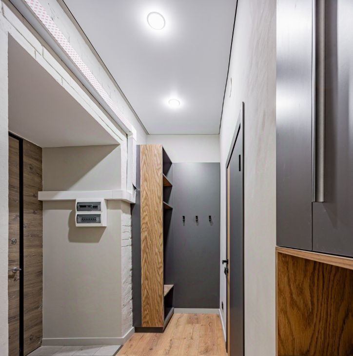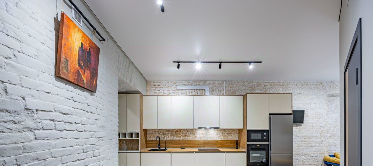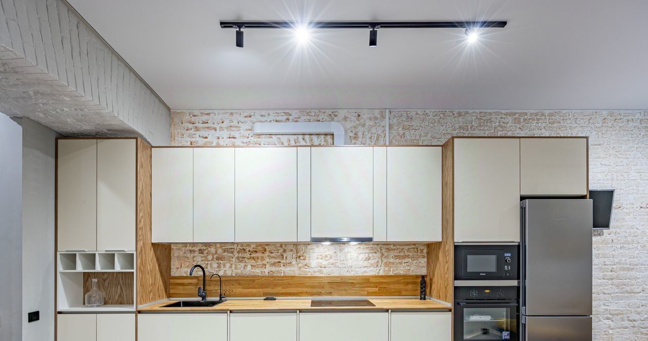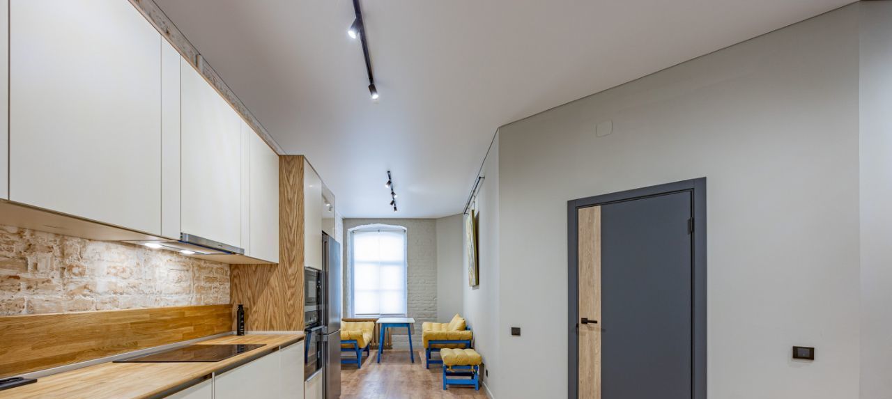 Встроенная кухня оборудована бытовой техникой и множеством мест хранения.