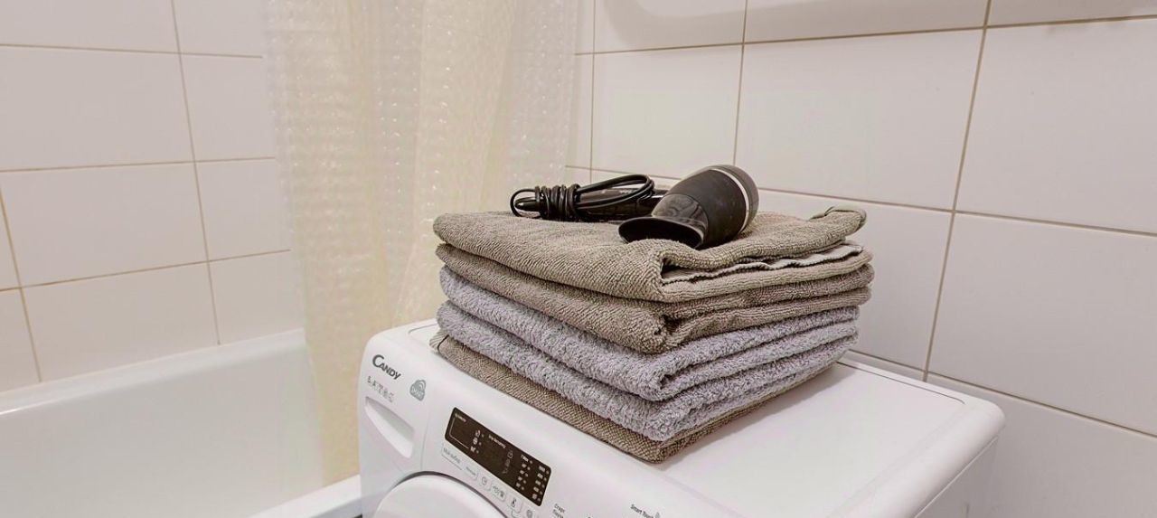 -Санузел с ванной и туалетом. Утюг и фен, а также стиральная машинка.