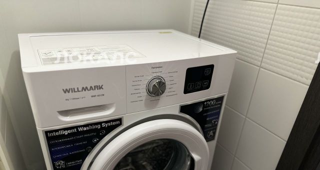 Кухня со всей необходимой техникой: холодильник, варочная панель, вытяжка, духовка, чайник, стиральная машина.