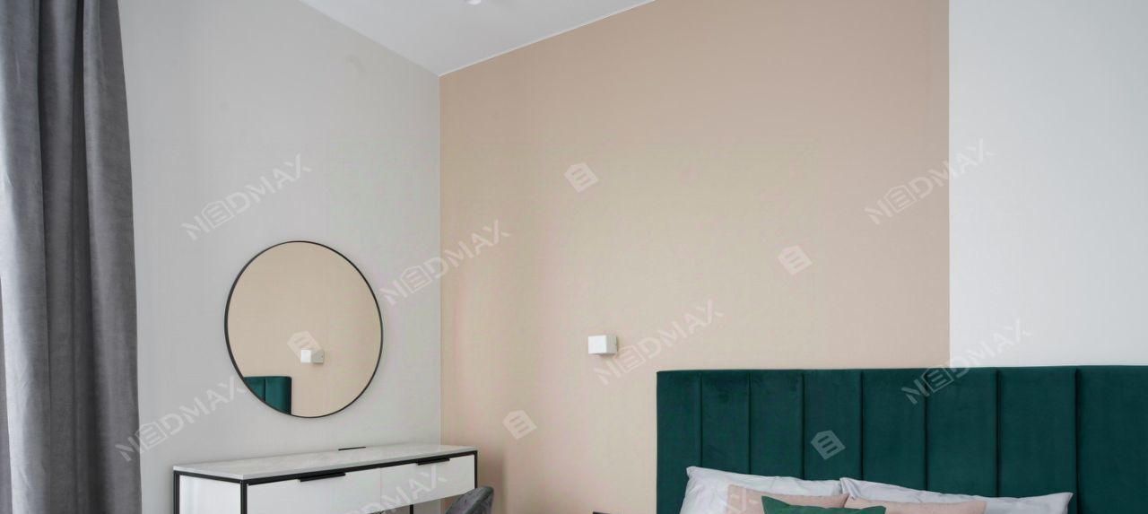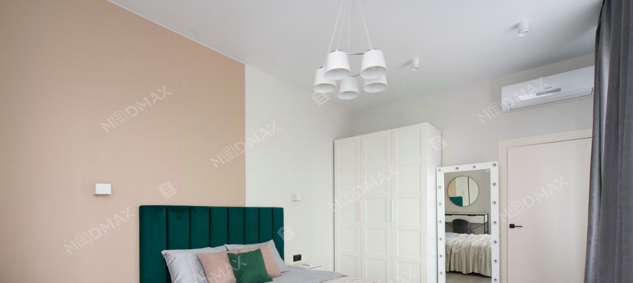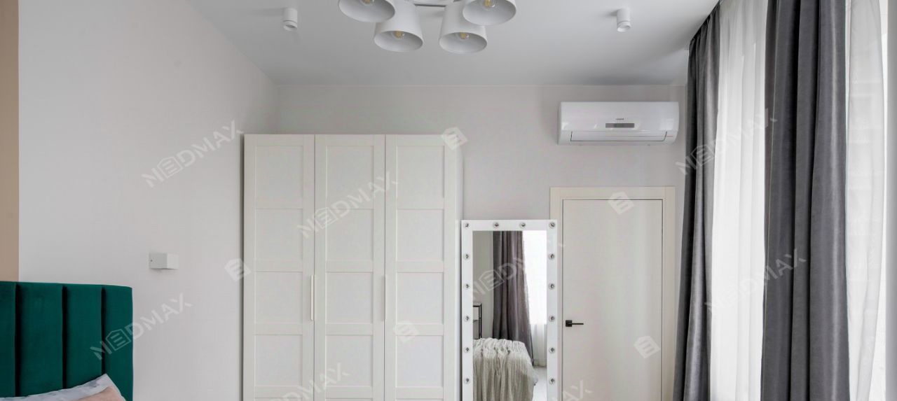 Просторная спальня оснащена двуспальной кроватью (160), шкафом для одежды, туалетным столиком и кондиционером.