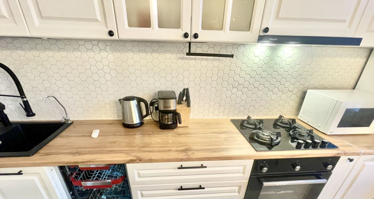 Двухкамерный холодильник, посудомоечная машина, кофемашина, духовой шкаф, газовая плита, СВЧ, эл.чайник, выдвижная вытяжная вентиляция набор посуды и столовые приборы.