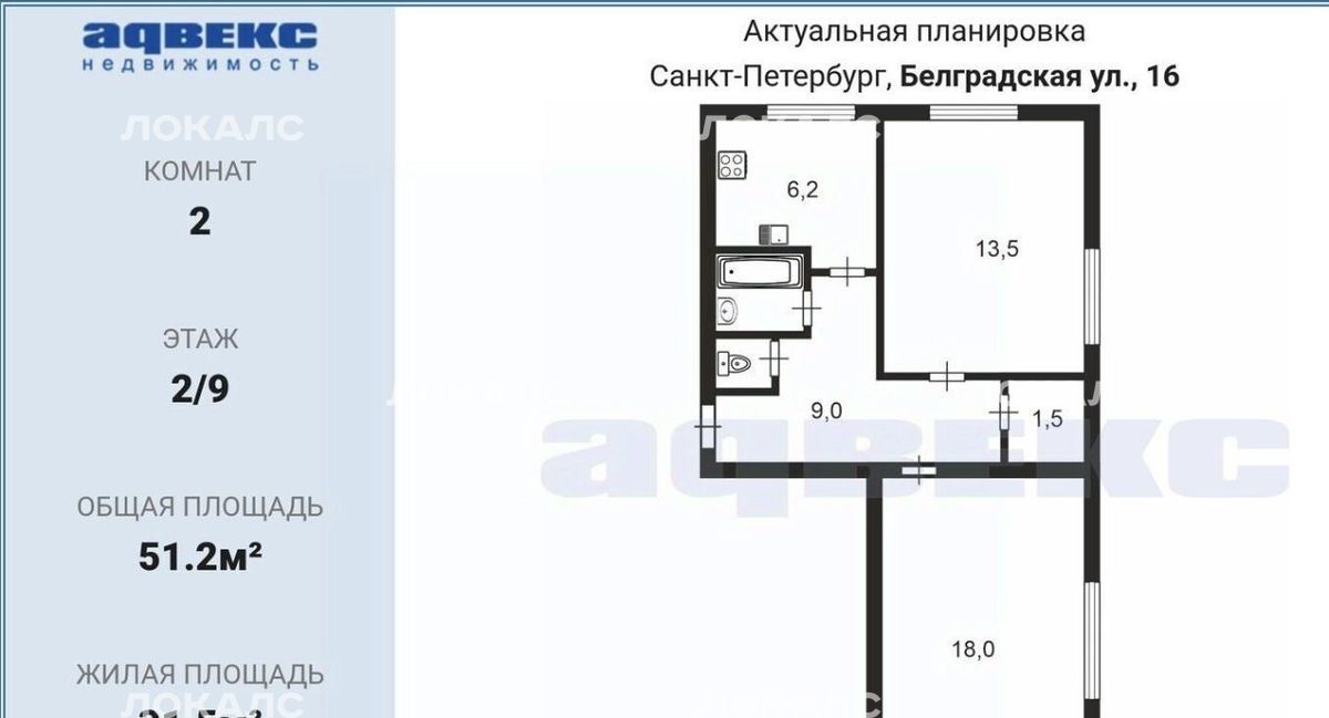 2-комнатная квартира: Санкт-Петербург, Белградская улица, 16 (51.2 м²)