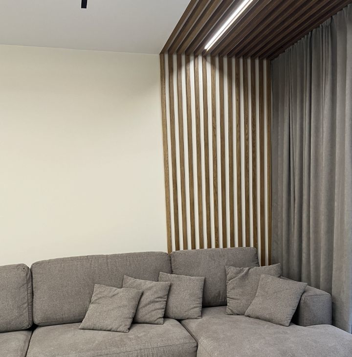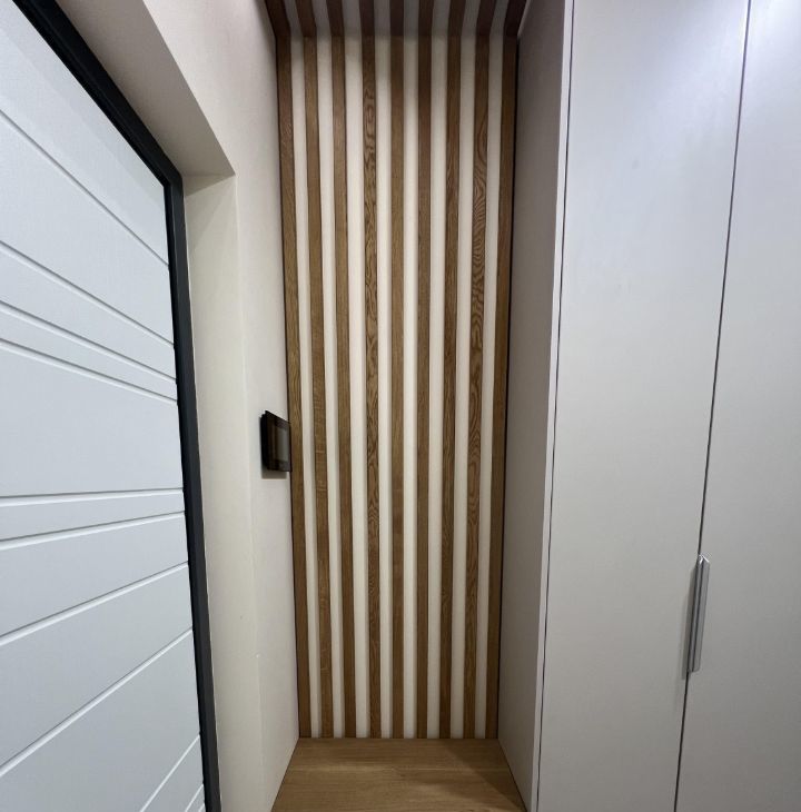 Все деревянные элементы интерьера (рейки в гостиной и прихожей, кухонный стол) изготовлены из цельного массива дуба.