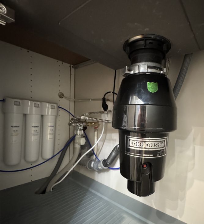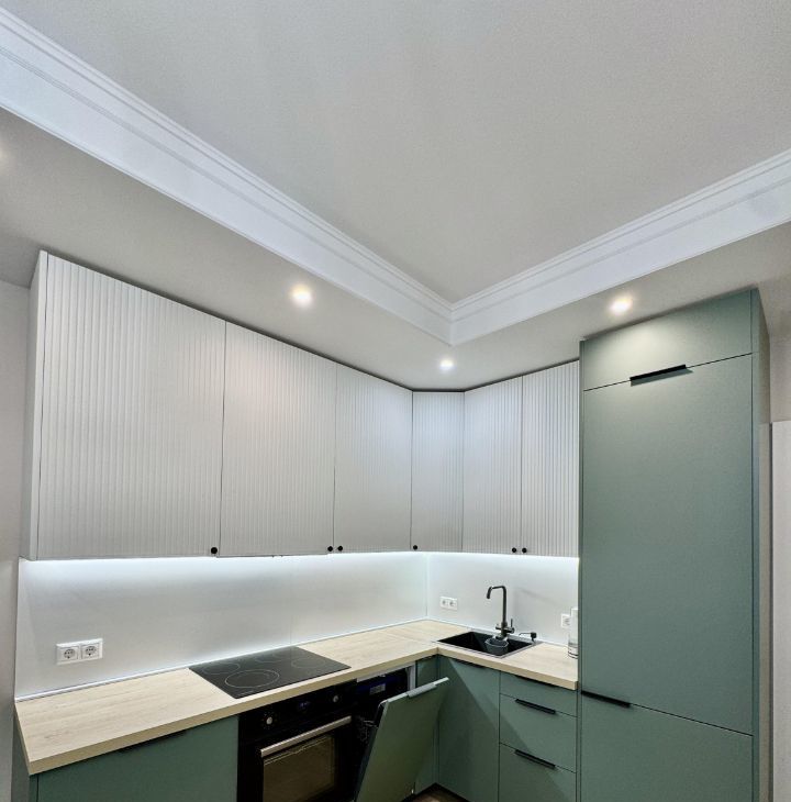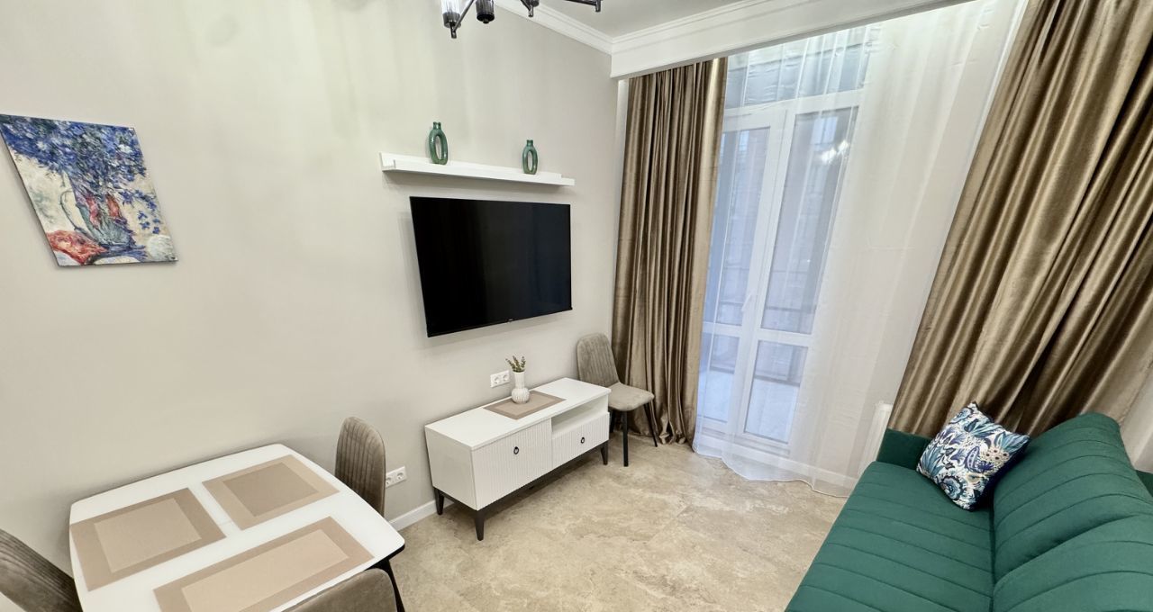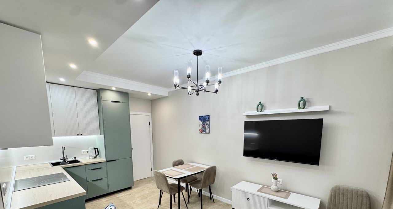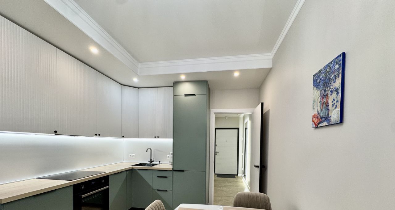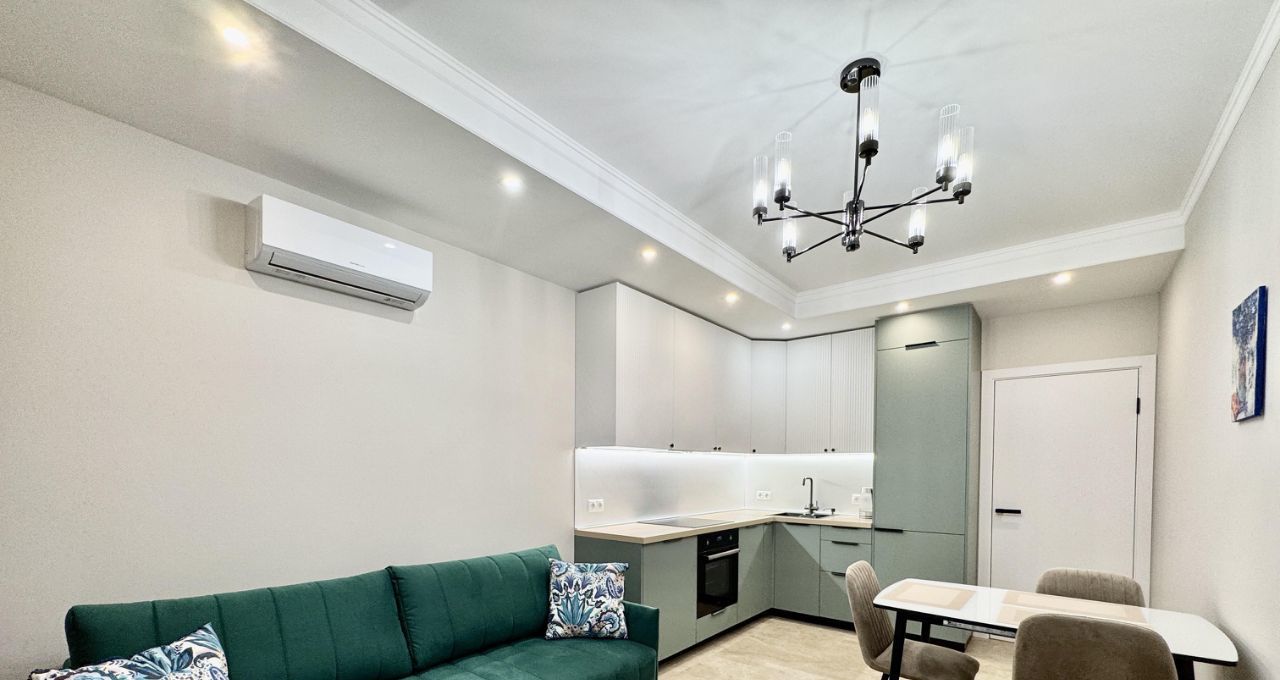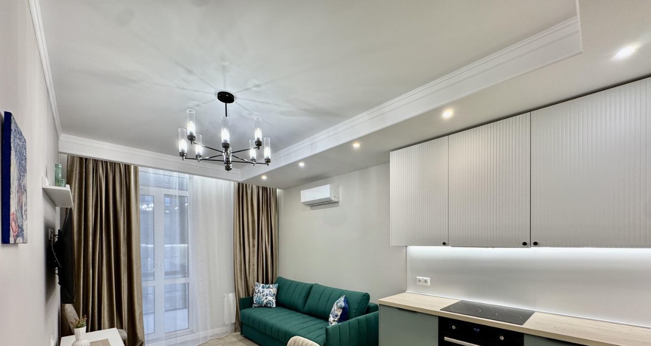 Кухня-гостиная оборудована встроенной кухней с необходимой техникой: посудомоечная машина на 45см, варочная поверхность, духовой шкаф, вытяжка, встроенный холодильник, эл.чайник. В раковине установлен измельчитель пищевых отдохов. Установлен фильтр питьевой и проточной воды. Кондиционер. Обеденный стол раскладывается, удобный просторный диван 2.20 в длину, который позволяет всей семье разместиться за просмотром телевизора.