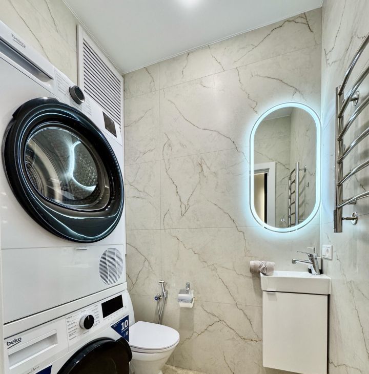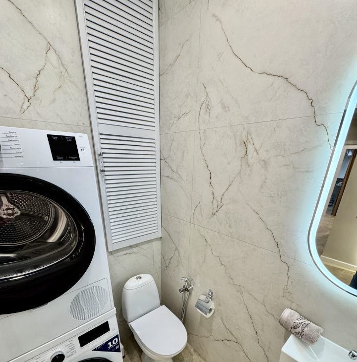 Санузел раздельный. Установлен проточный нагреватель воды. Подключены стиральная и сушильная машины.