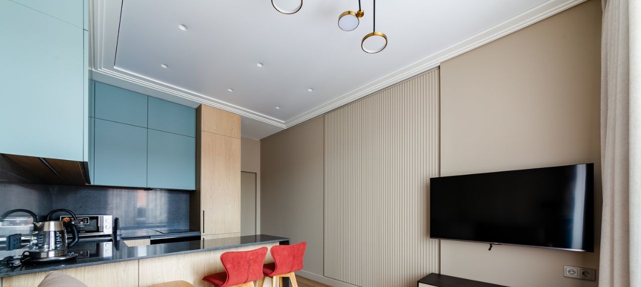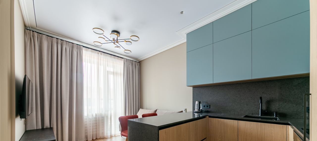 - Просторная зона кухни, оснащенная всей необходимой техникой бренда Korting: варочная панель, духовка, микроволновая печь, холодильник и посудомоечная машина. Для вашего удобства предусмотрена вся посуда, чтобы начать жить сразу после заселения.