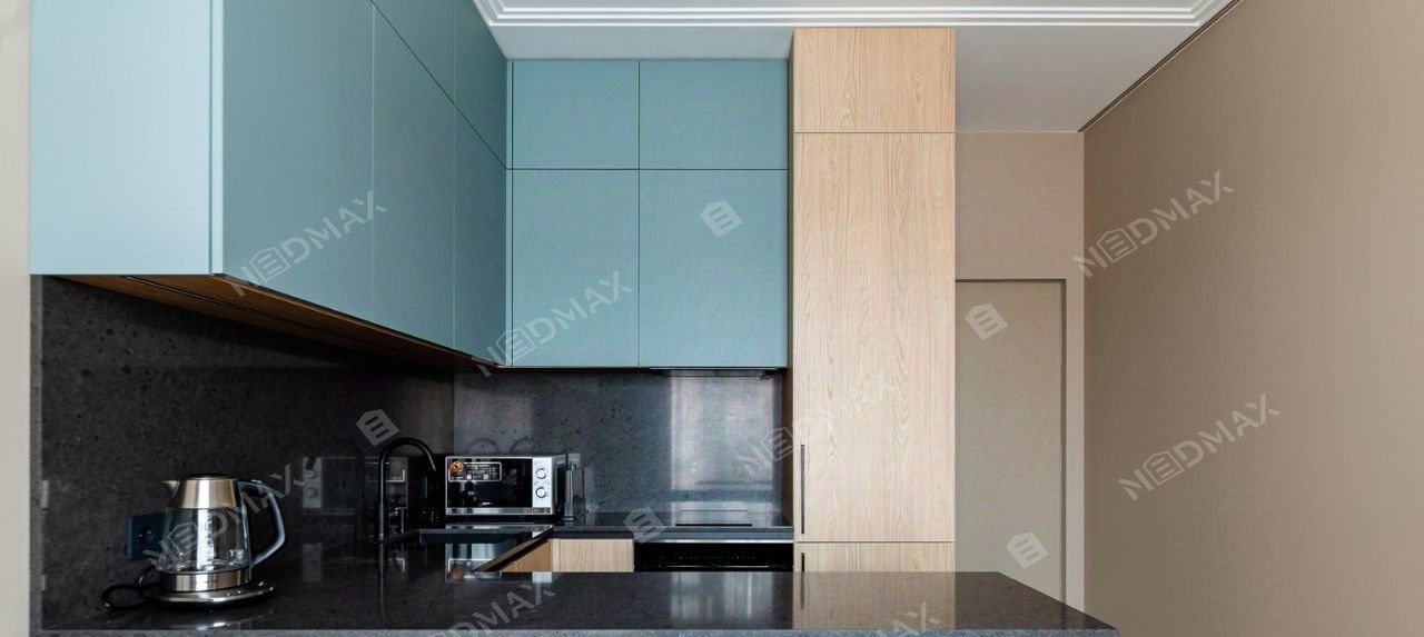 Кухонная зона, оснащена всей необходимой техникой(в т.ч. посудомоечной машиной) бренда Korting. Есть вся необходимая посуда.