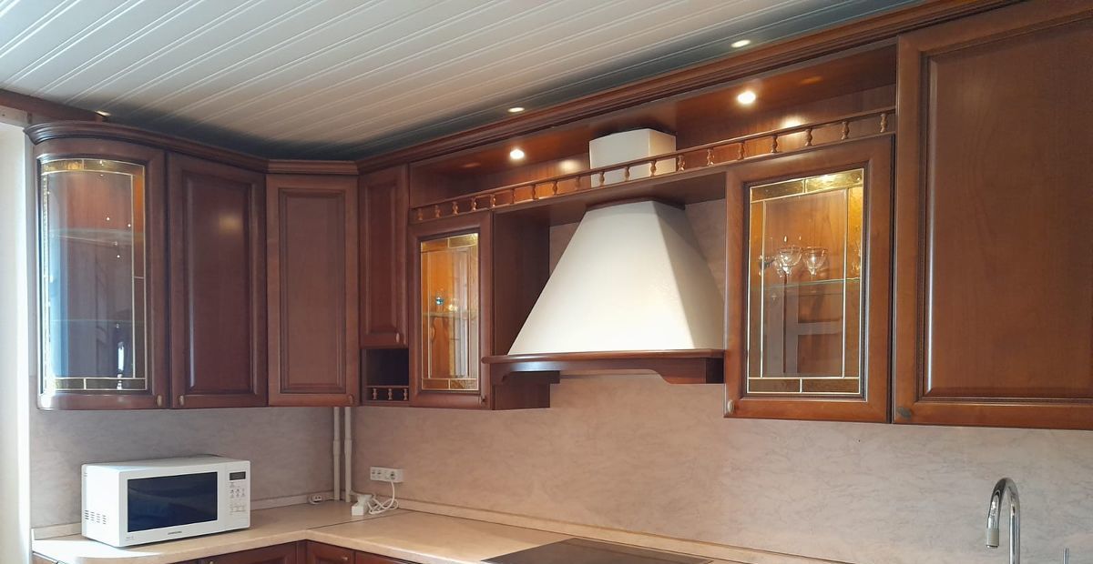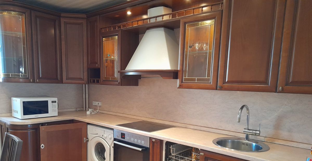 Большая кухня 12 м2. Остается итальянский кухонный гарнитур из массива красного дерева по всю длину стены с углом. Встроенная европейская бытовая техника: электроплита BOSCH, посудомоечная машина Zanussi, стиральная машина Ariston вместимостью 5,5 кг, кухонная вытяжка.
