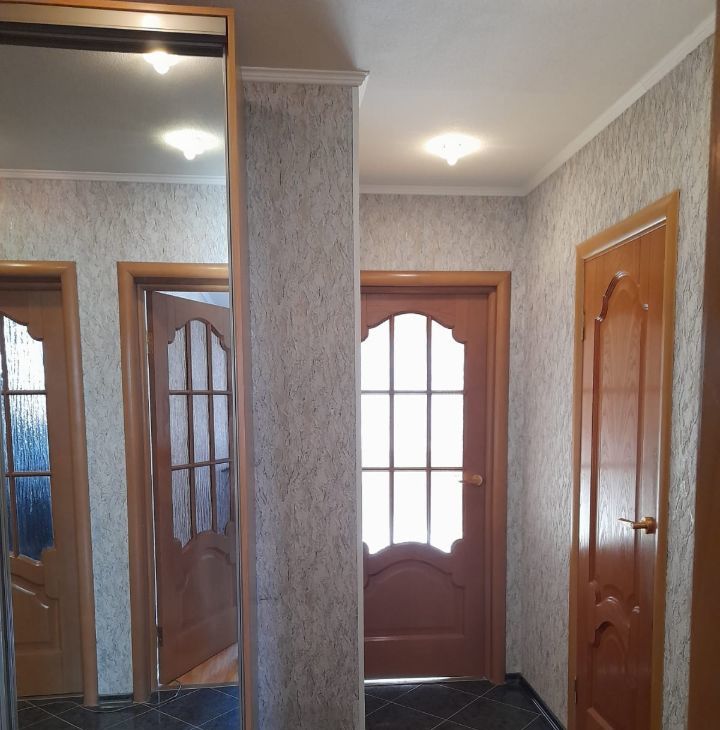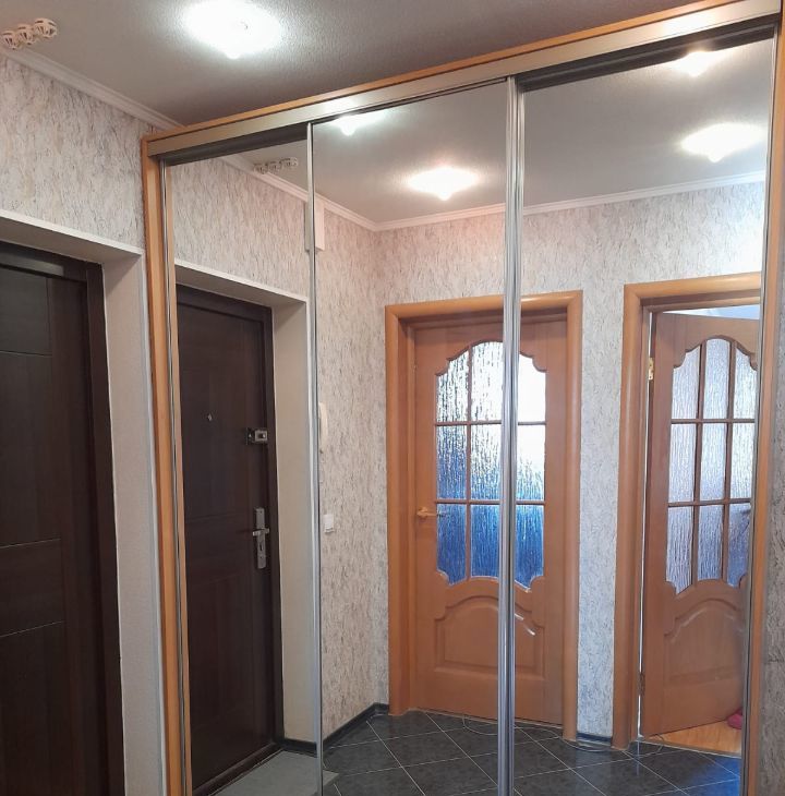 Просторный квадратный коридор 8 м2. Остается большой трехстворчатый шкаф-купе с зеркальными дверьми.