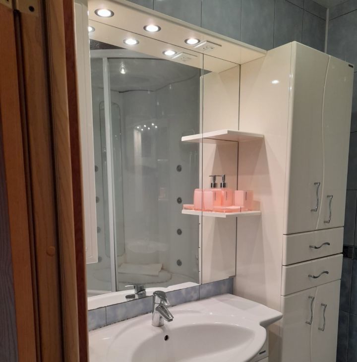 В ванной комнате большая итальянская душевая кабина с джакузи. Остается вся мебель для ванной комнаты. Санузел раздельный.
