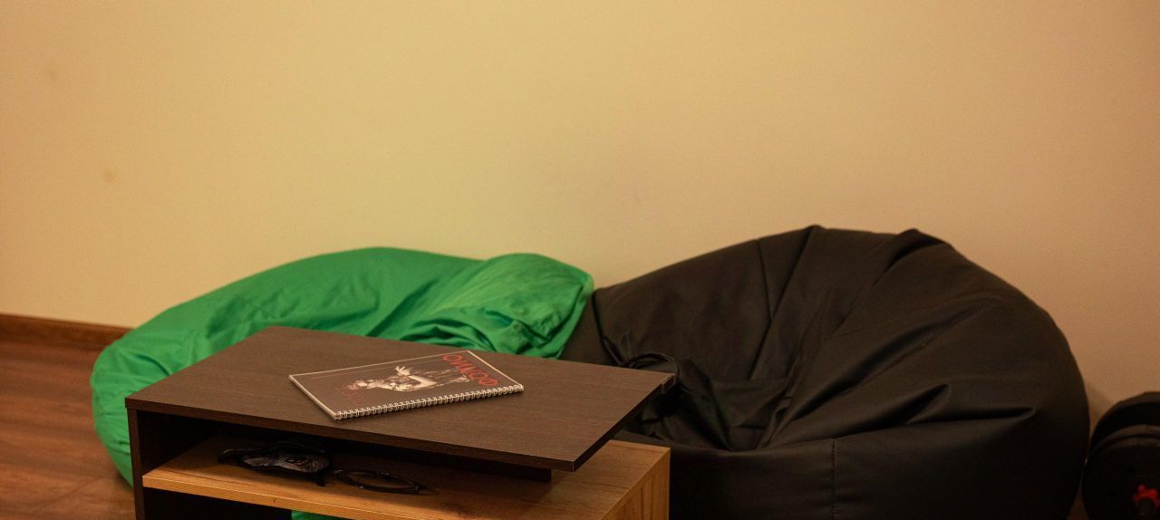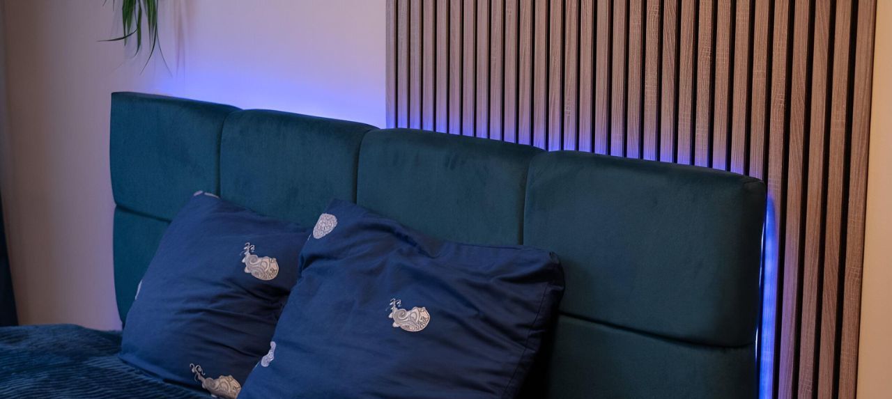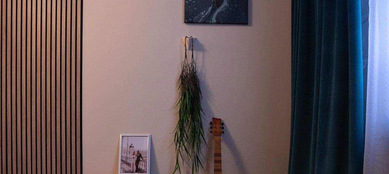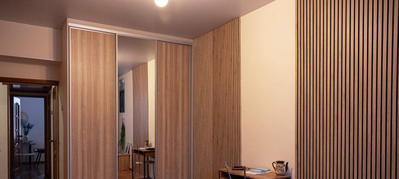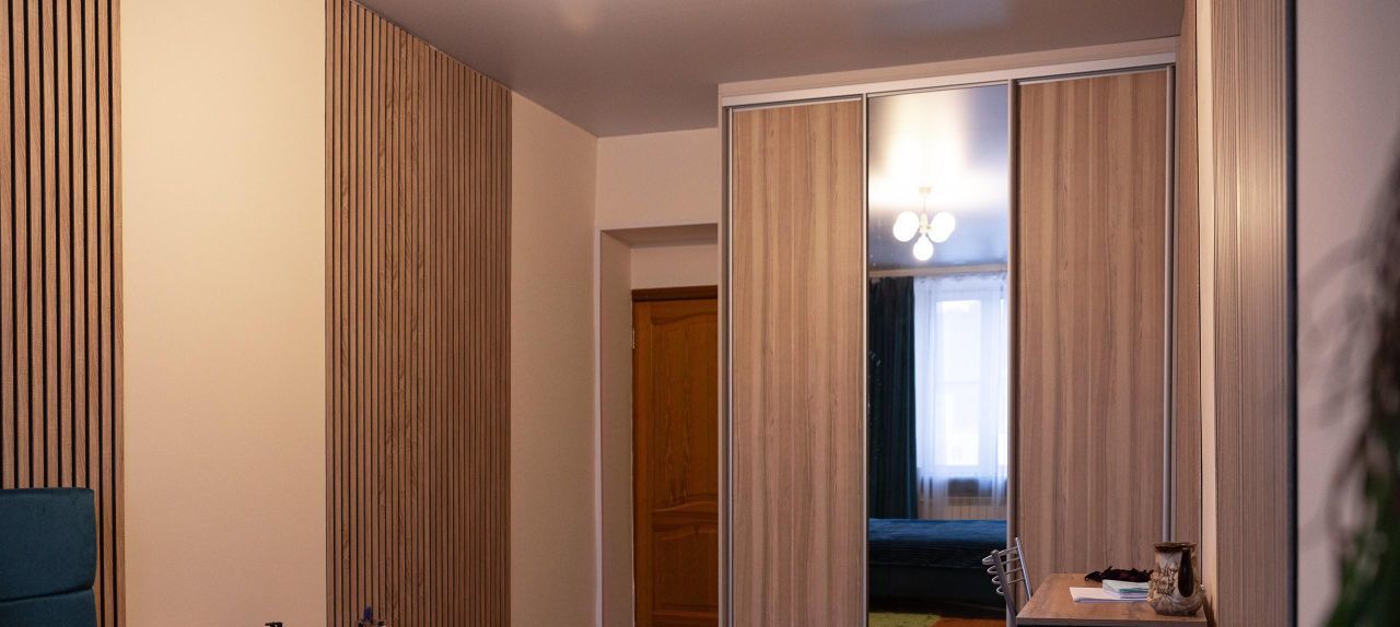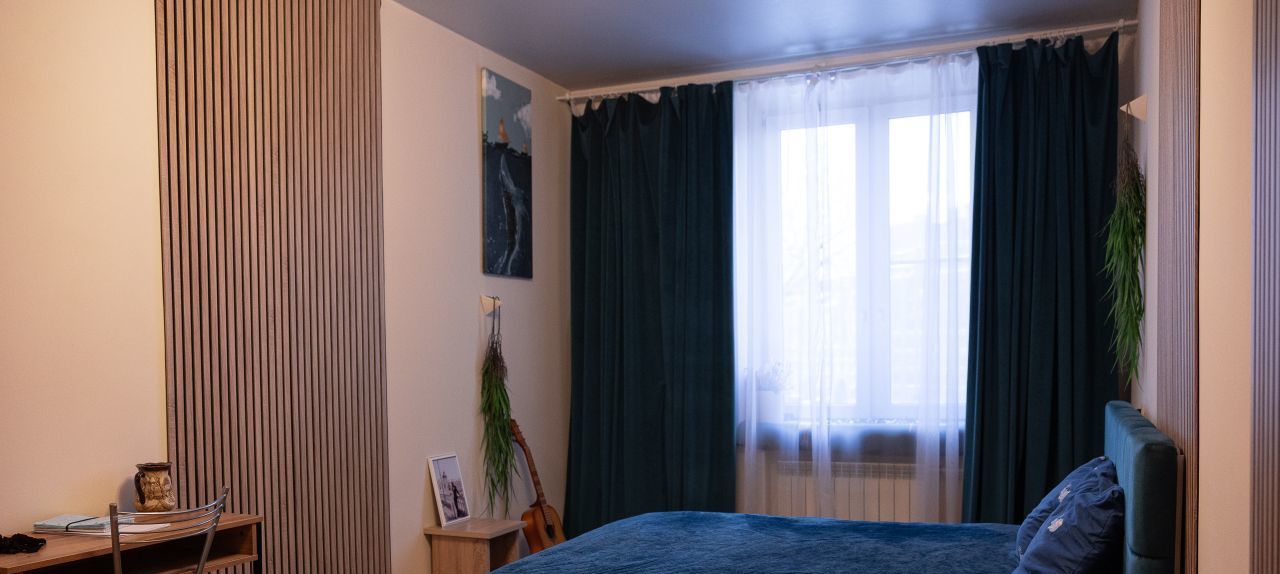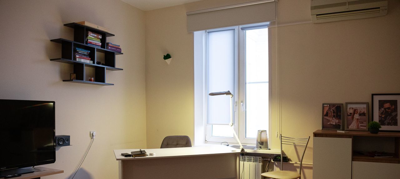 Два окна выходят в тихий зелёный двор, во дворе всегда есть парковочные места, даже в ночное время. Высокий потолок позволил установить новый шкаф-купе высотой 3 метра и шириной 2 метра, широкая двуспальная кровать с подсветкой RGB по периметру, два письменных стола со стульями.