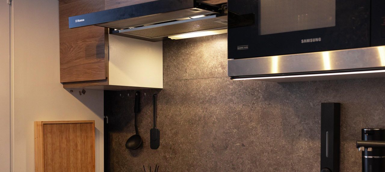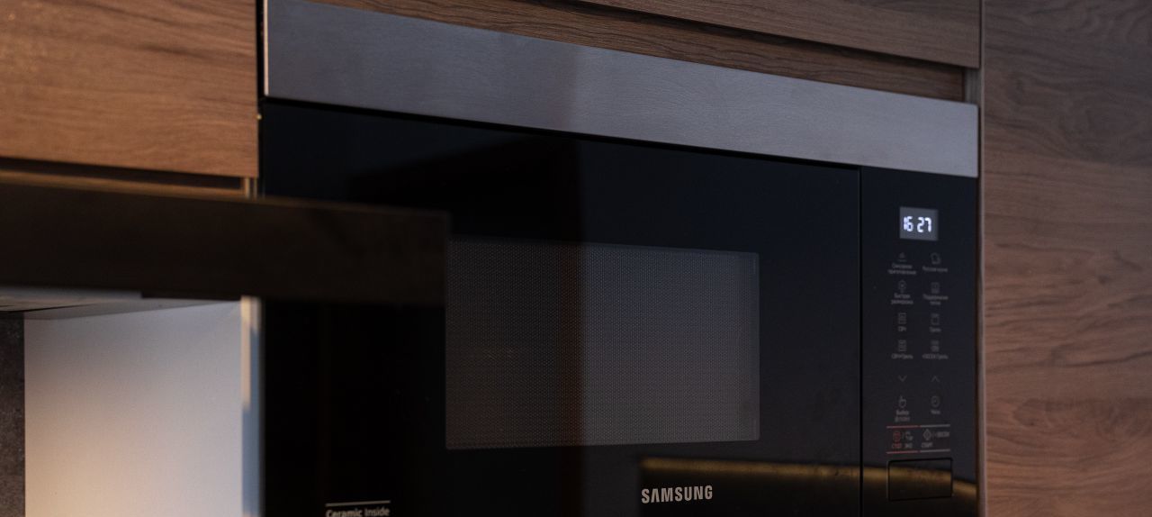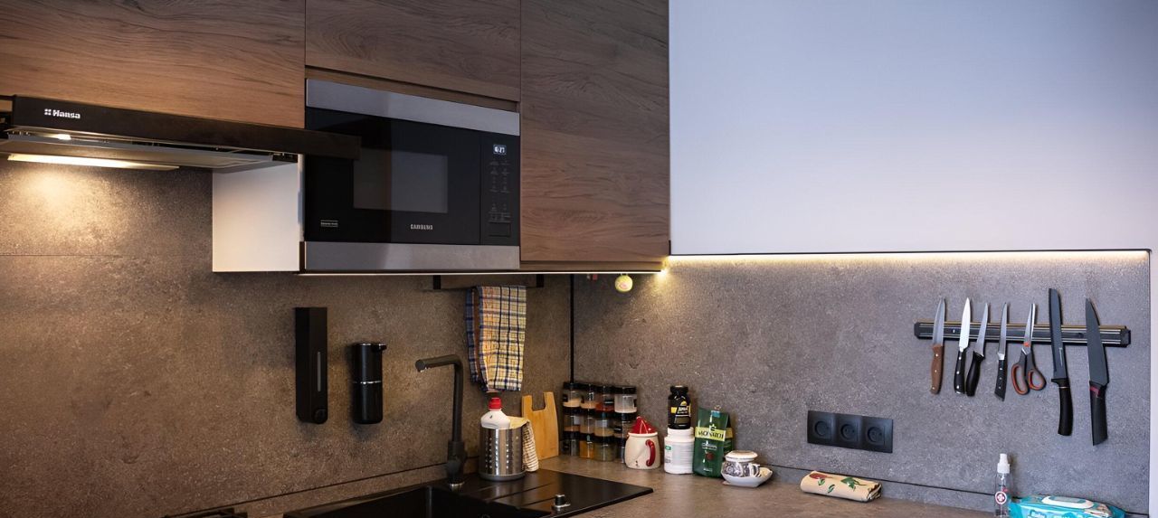 Вся кухонная техника новая и встроенная к гарнитур: духовка с конвекцией, варочная панель, вытяжка, посудомоечная машина 60 см, микроволновая печь, холодильник, стиральная машина, сушилка для белья. Кухонный гарнитур выполнен на заказ - антресоли до потолка