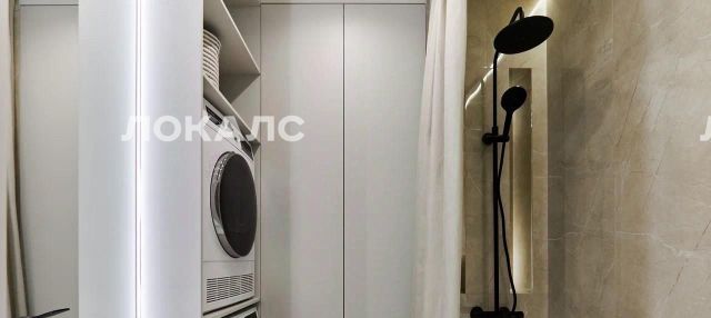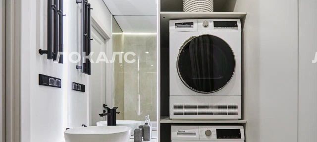 Ванная комната с душевой системой, ванной, раковиной и огромным стильным зеркалом для утренних сборов. А самое главное, в ванной комнате расположены стиральная и сушильные машины для удобства стирки будущих жильцов.