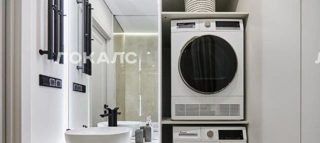 Ванная комната с душевой системой, ванной, раковиной и огромным стильным зеркалом для утренних сборов. А самое главное, в ванной комнате расположены стиральная и сушильные машины для удобства стирки будущих жильцов.