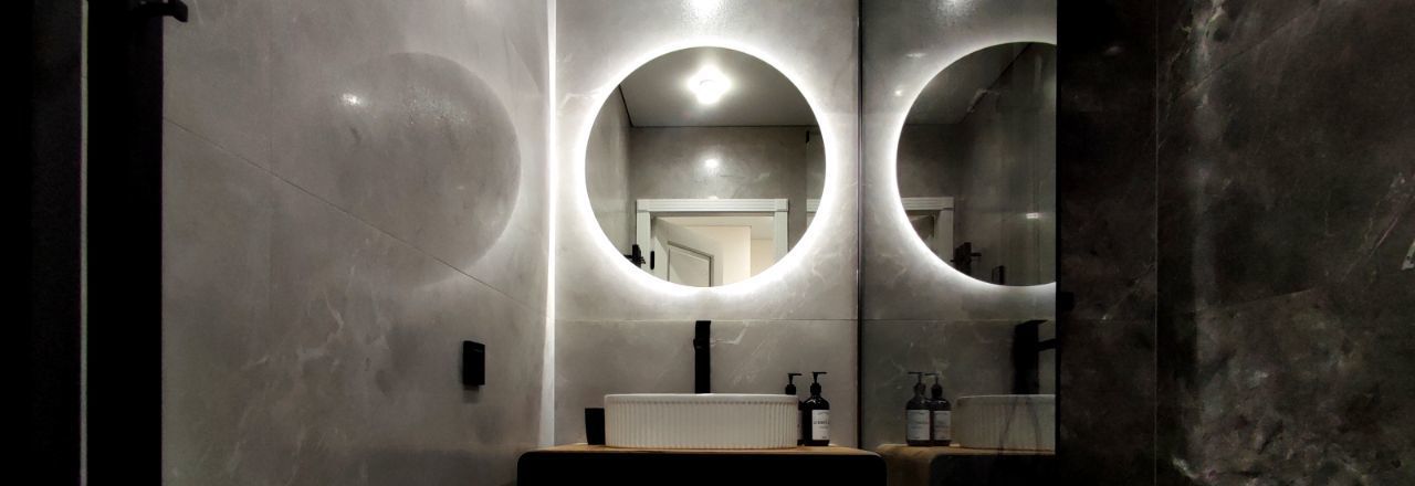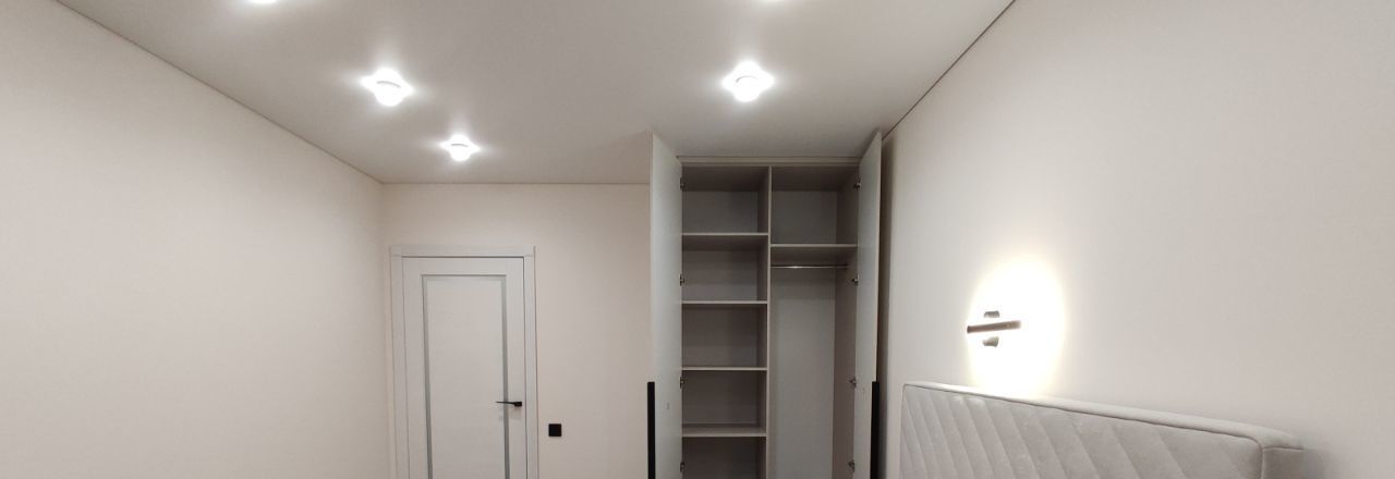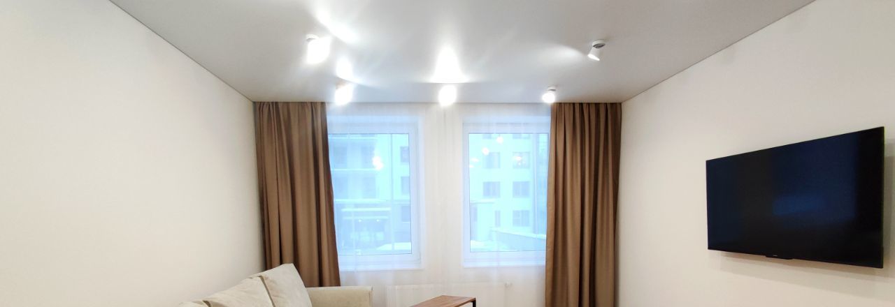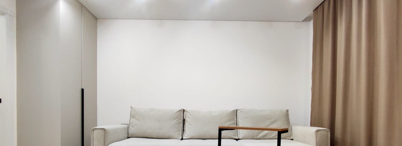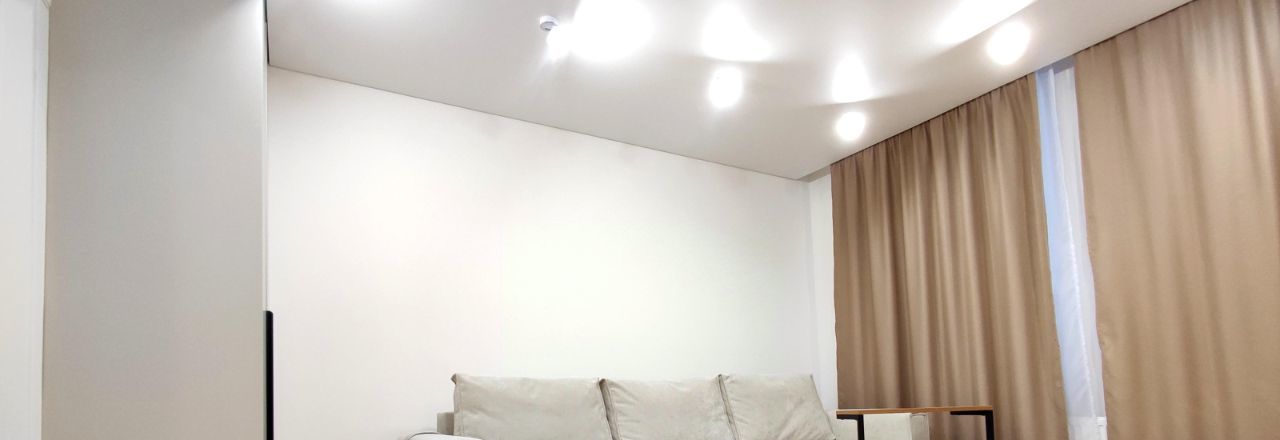 Стильная зона с диваном-кроватью, шкафом, большим Smart TV, роскошным зеркалом в пол.