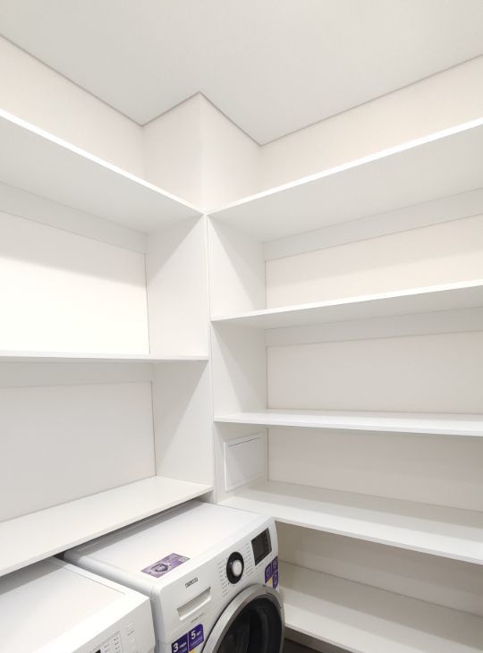 Просторная гардеробная во входной зоне и отдельный гардероб-постирочная со стиральной и сушильной машинами.