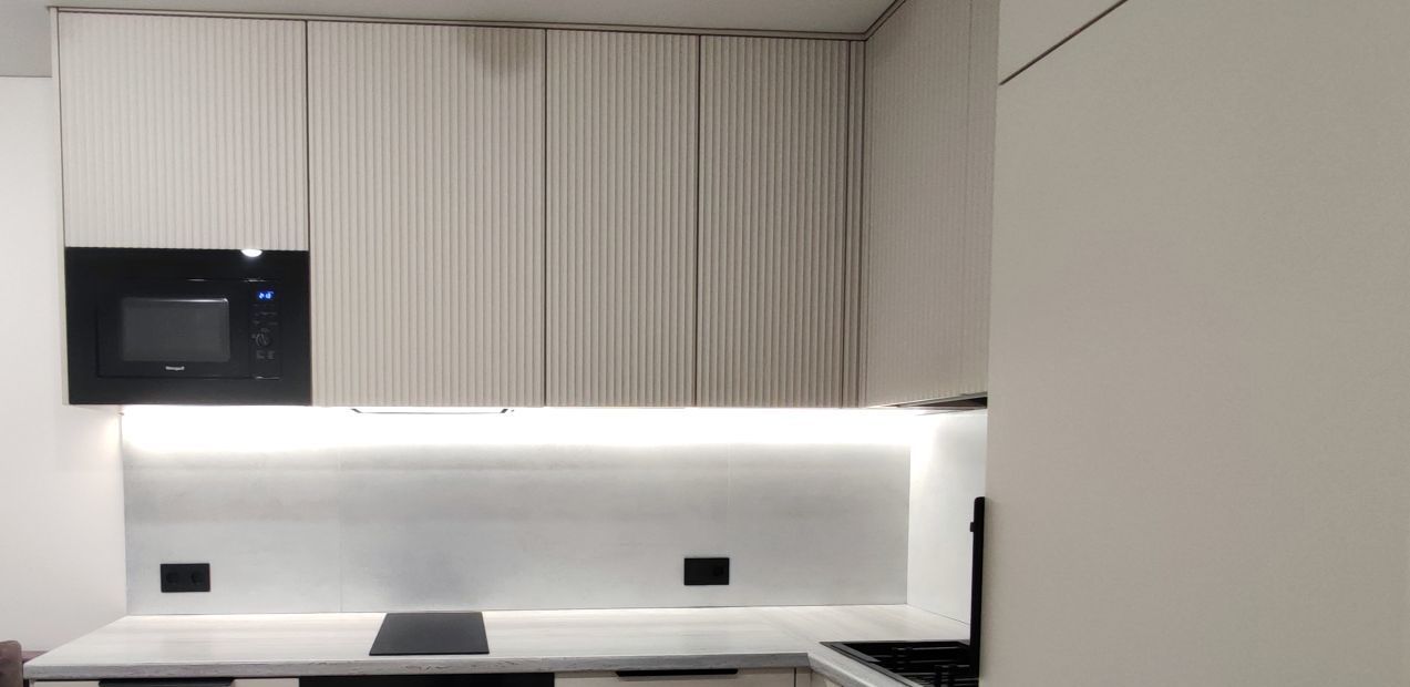 Функциональная, с новейшей встроенной техникой (варочная панель, духовка, посудомоечная машина, микроволновка, холодильник) и полным набором посуды.
