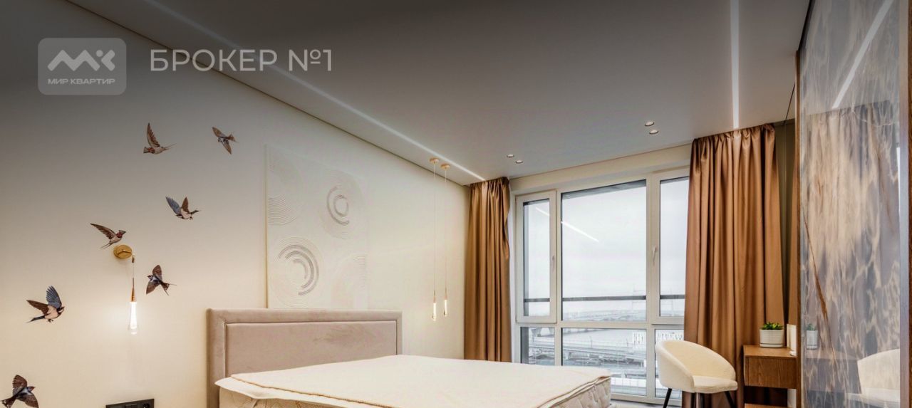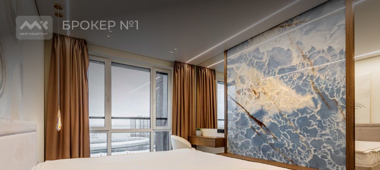Ценная особенность данной квартиры - панорамное остекление в каждой комнате, которое создает ощущение простора и свободы. Из спальни открывается роскошный вид на воду и панораму города.