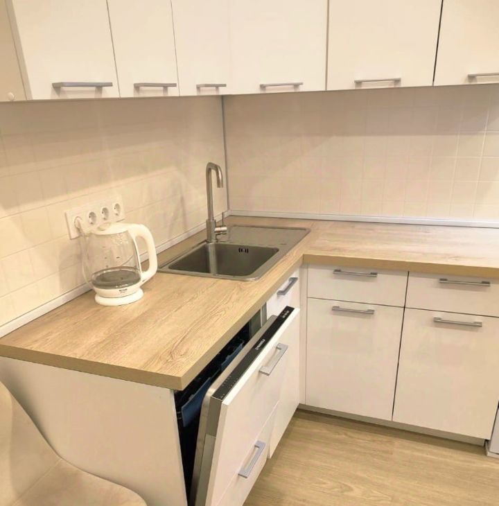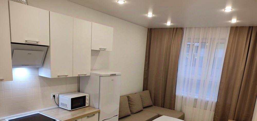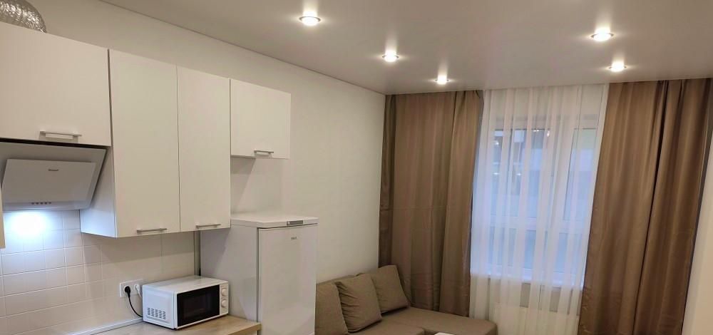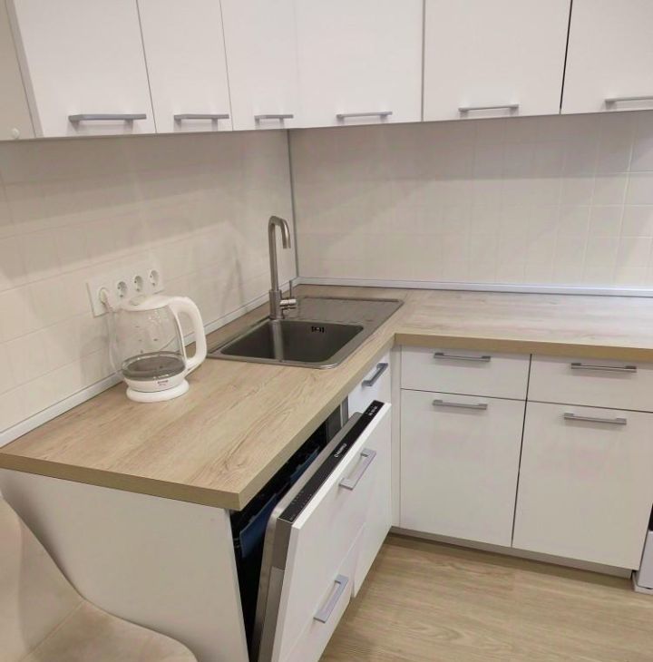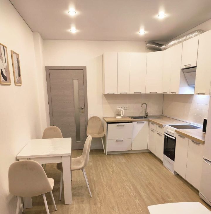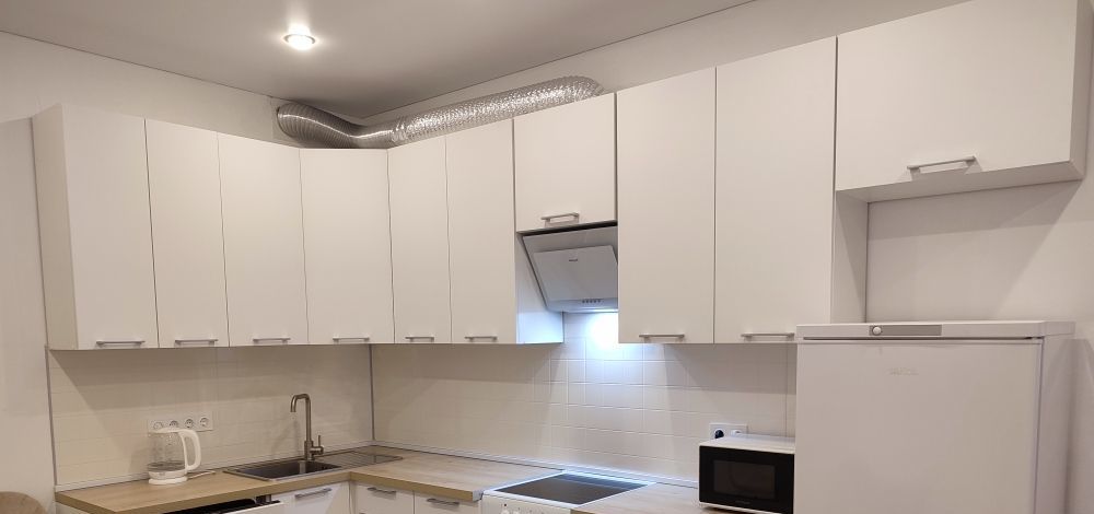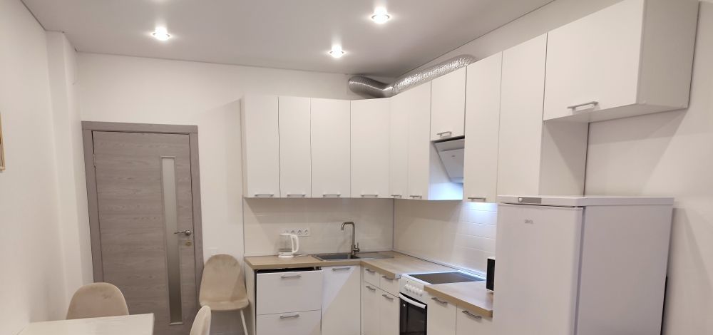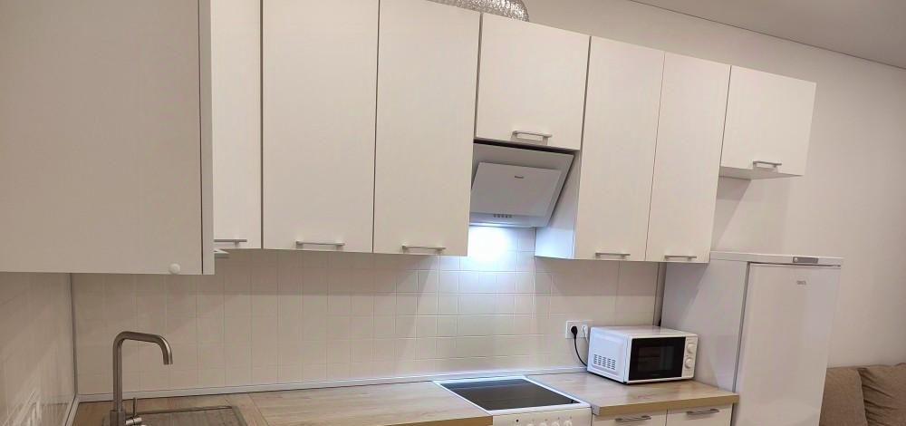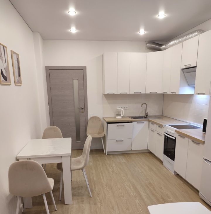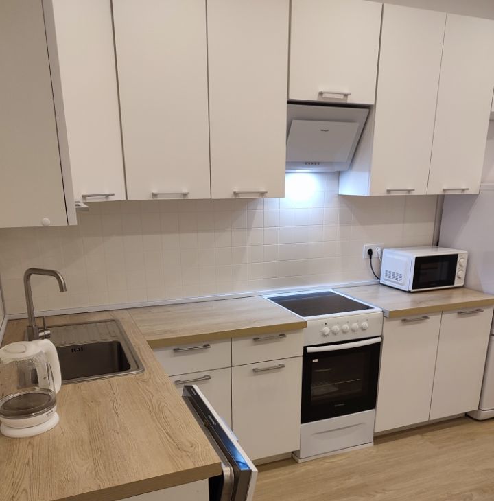 Большой удобный кухонный гарнитур, с холодильником, плитой, вытяжкой, духовкой, посудомоечной машиной, микроволновкой и чайником, всё для полноценного приготовления пищи. Обеденная зона со столом и стульями, стол при желании раскладывается. Зона отдыха с диваном, небольшим журнальным столиком и комодом.
