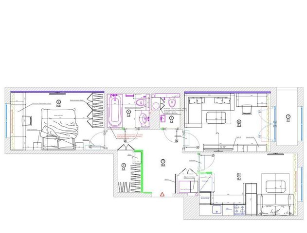 В квартире выполнены штукатурные работы, начаты электротехнические и сантехнические работы, установлены бойлер и система фильтрации воды, проведены коммуникации для трех кондиционеров, установлен каркас для гипсокартонного потолка и закуплен сам гипсокартон, проложена шумоизоляция потолков и стен, контактирующих с соседями
