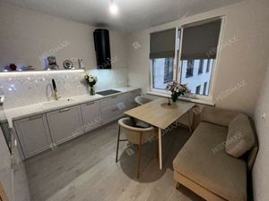 Полностью укомплектованная новой бытовой техникой: индукционная плита, посудомоечная машина, встроенный холодильник, стиральная машина, микроволновка.