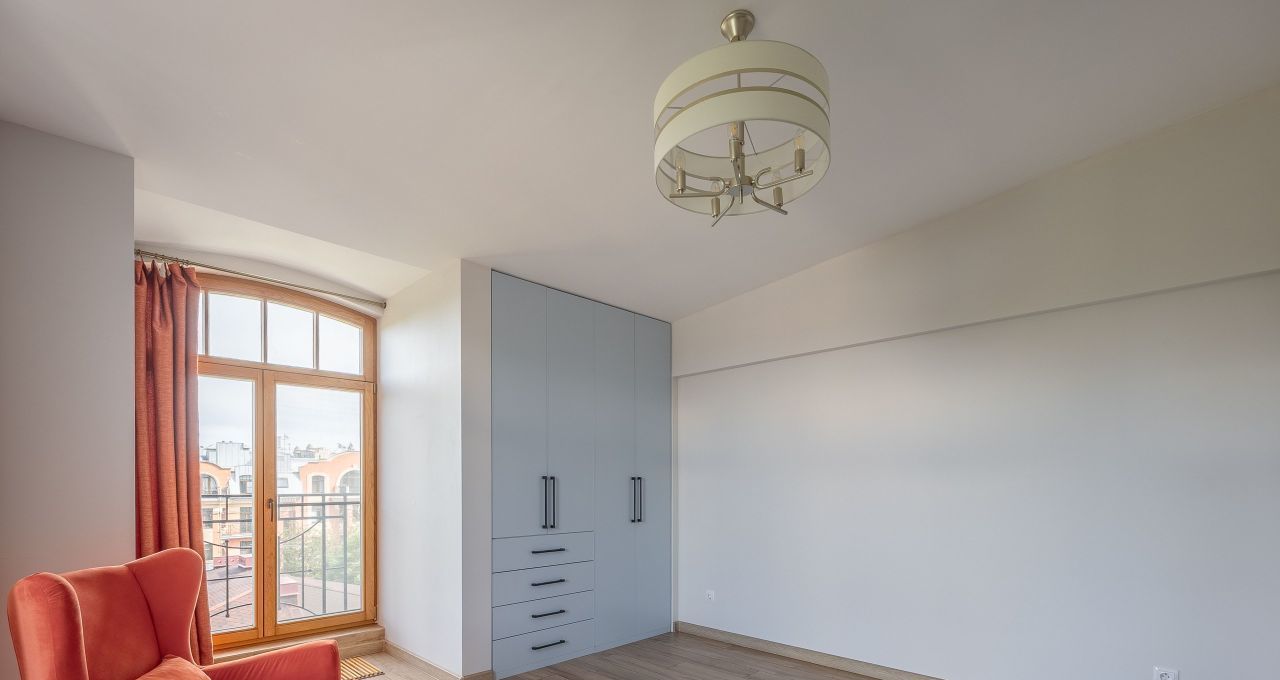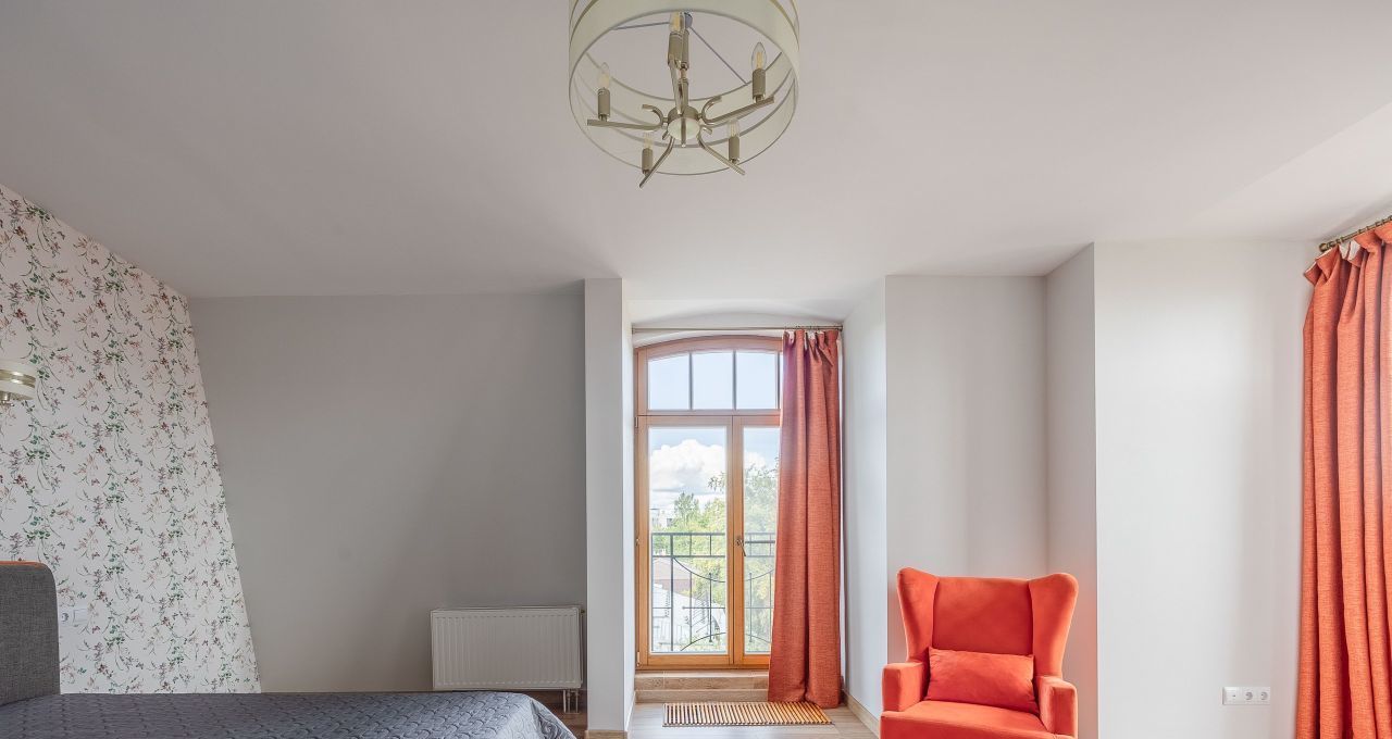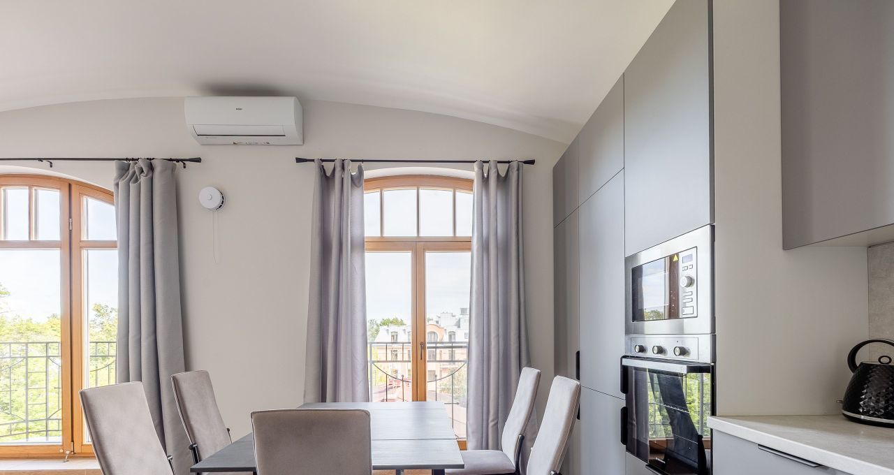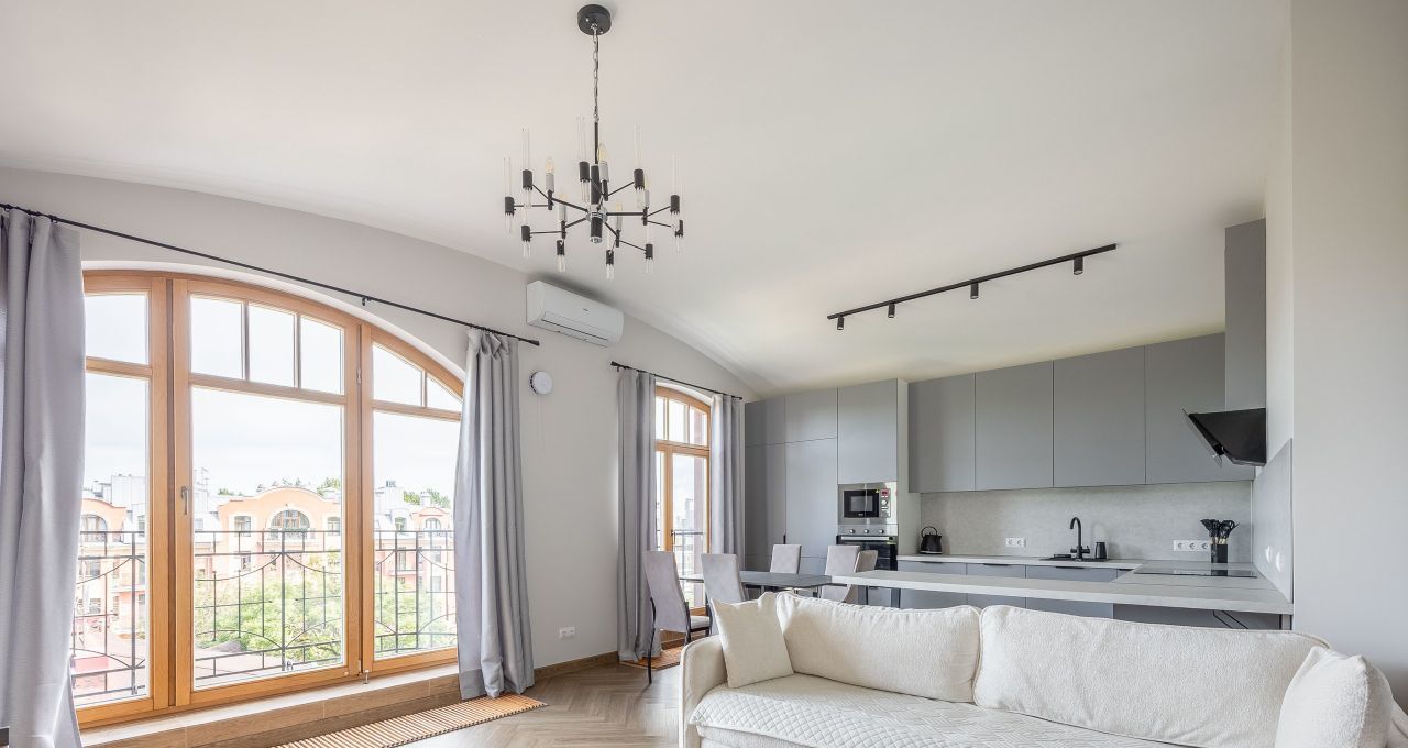Квартира имеет удобную планировку, арочные потолки достигают 3,5 метров в высоту, в каждой комнате большие окна высотой 3 метра с выходом на балконы, откуда открываются красивые виды на район.