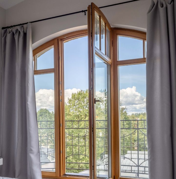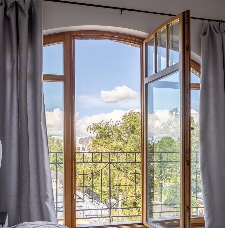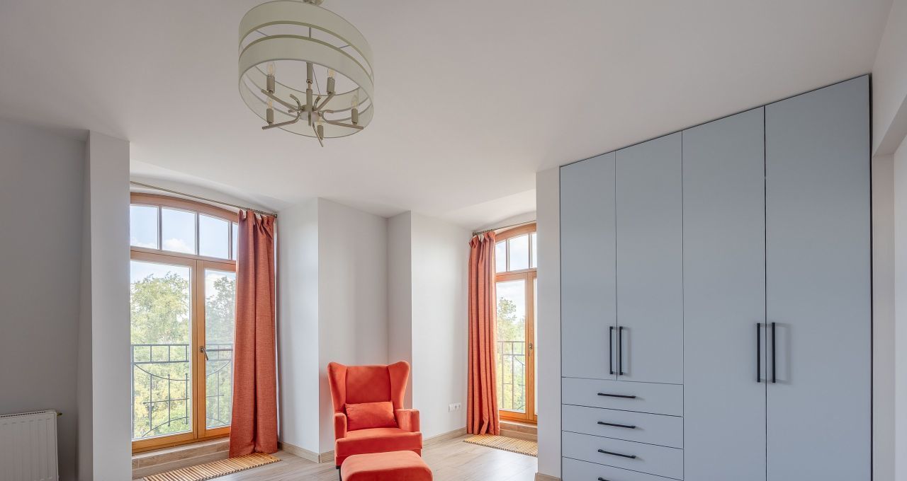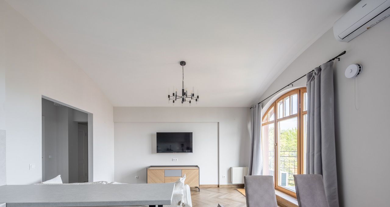 Квартира имеет удобную планировку, арочные потолки достигают 3,5 метров в высоту, в каждой комнате большие окна высотой 3 метра с выходом на балконы, откуда открываются красивые виды на район.