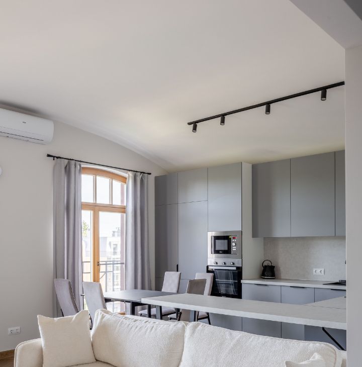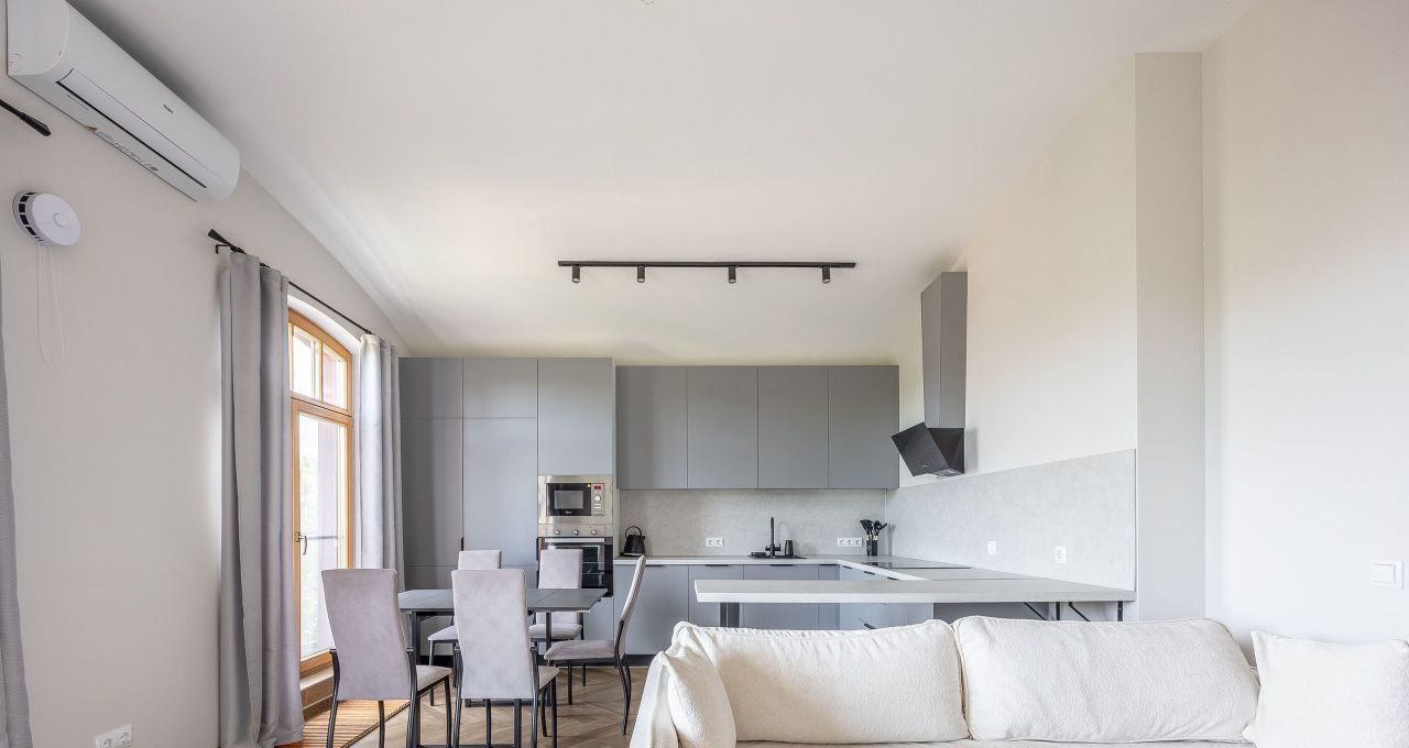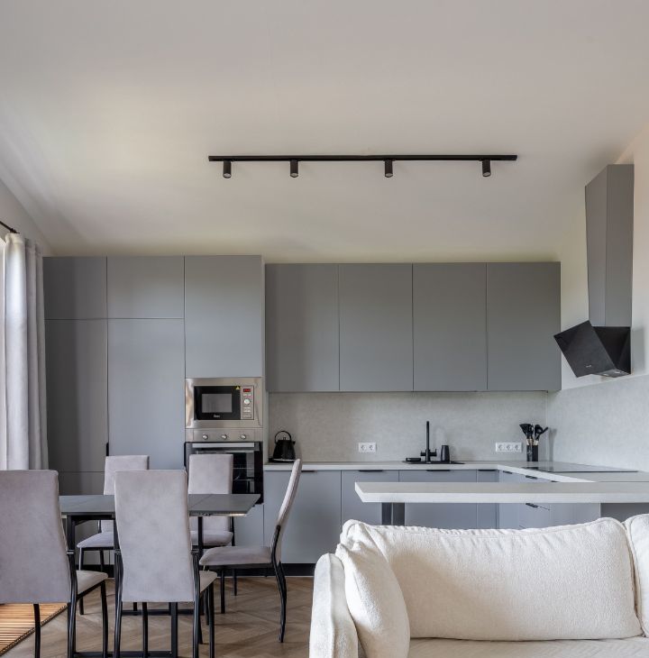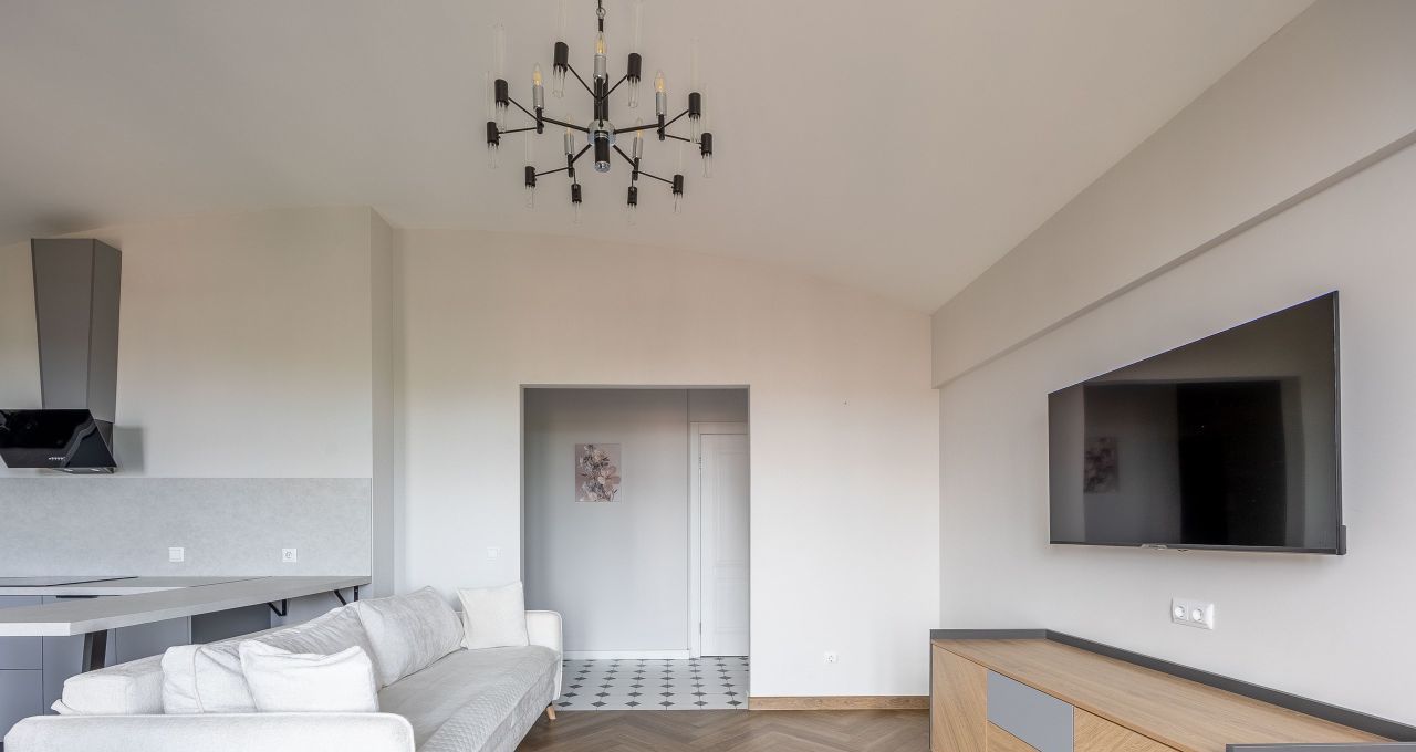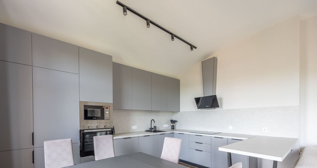 - Кухня- гостиная (30 м2) располагает: удобным двуспальным диваном 160*200 и комодом. Также, имеется телевизор со Смарт-тв, диагональю 47. На кухне имеется полноценный гарнитур со всей необходимой техникой: встроенный холодильник и посудомоечная машина, плита, микроволновая печь, встроенный холодильник, чайник. Также, эта комната располагает кондиционером.