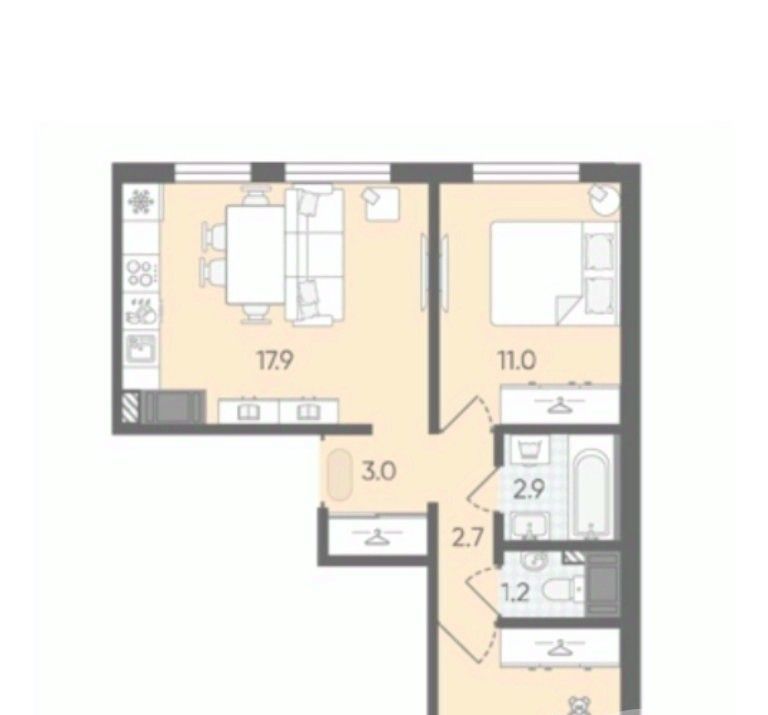 Общая площадь квартиры 51 м2. Комнаты изолированные 11 и 12 м2. Кухня - гостинная 18,3 м2. Раздельный с/у.