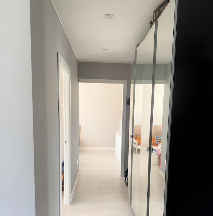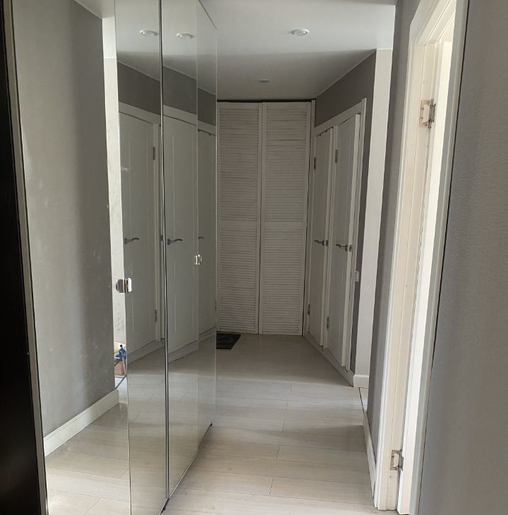 В квартире остается кухонная мебель, холодильник, посудомойка, зеркальные шкафы Икеа.