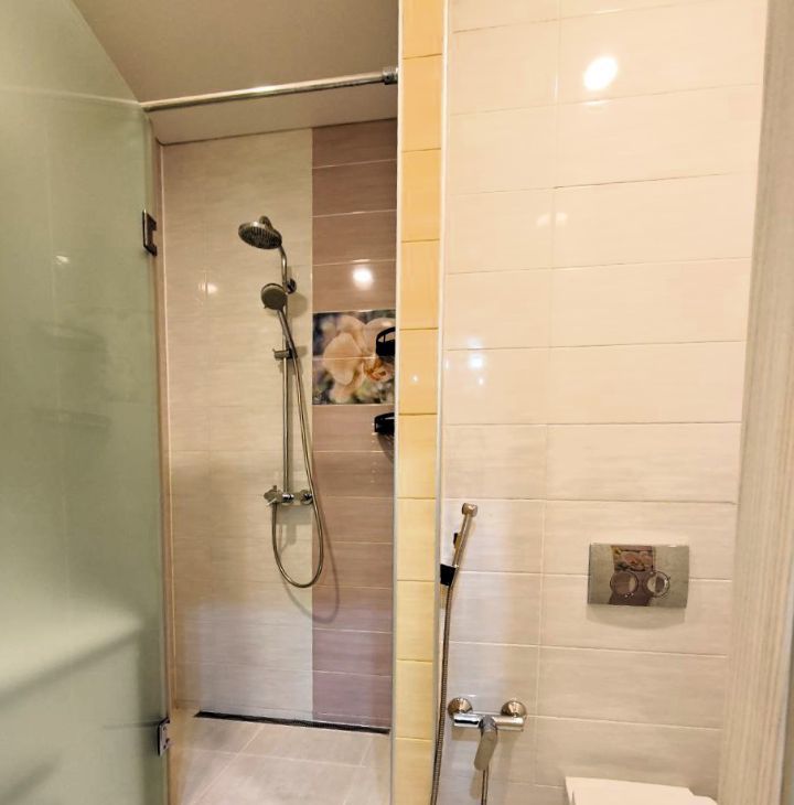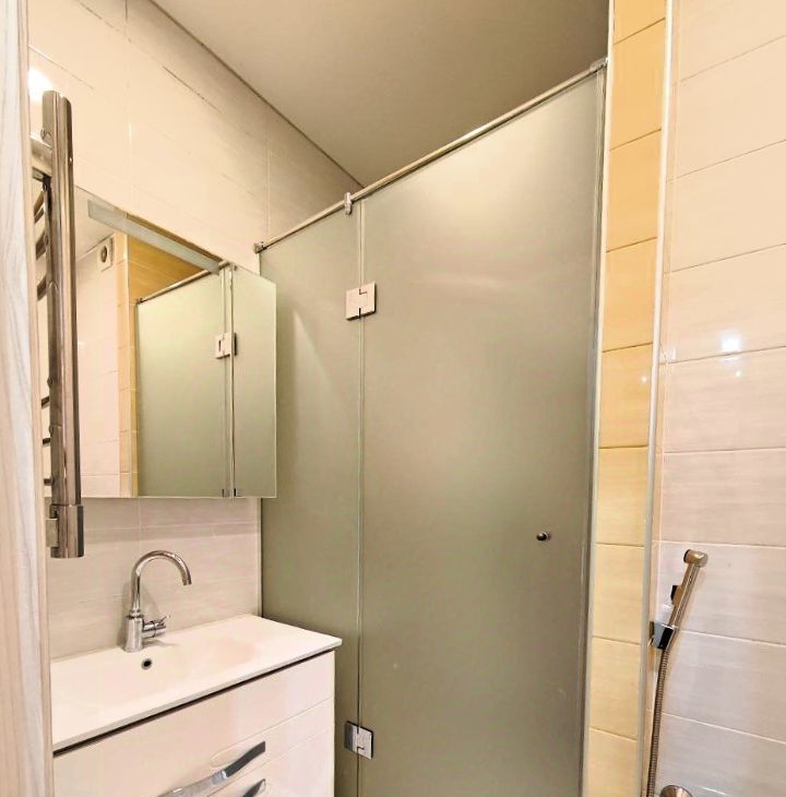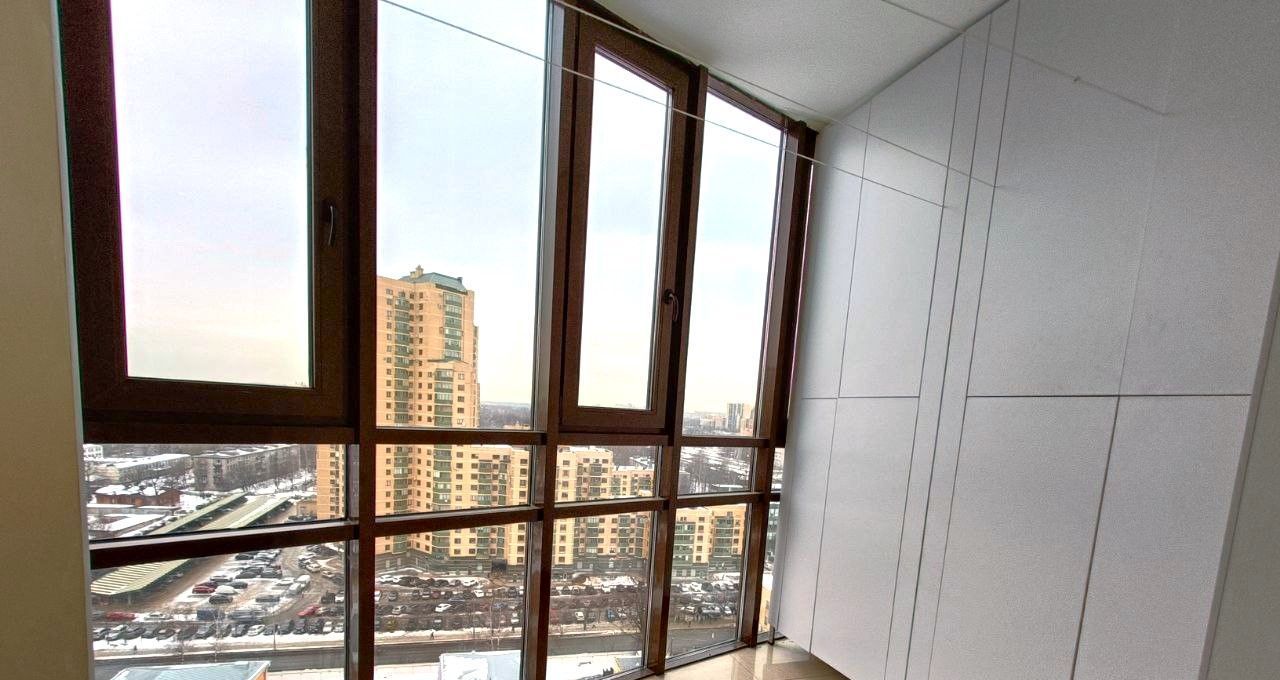 Квартира расположена на последнем 17-м этаже. Потолки 3 м. Балкон с тёплым остеклением и тёплым полом, панорамные французские окна. Санузел совмещённый.