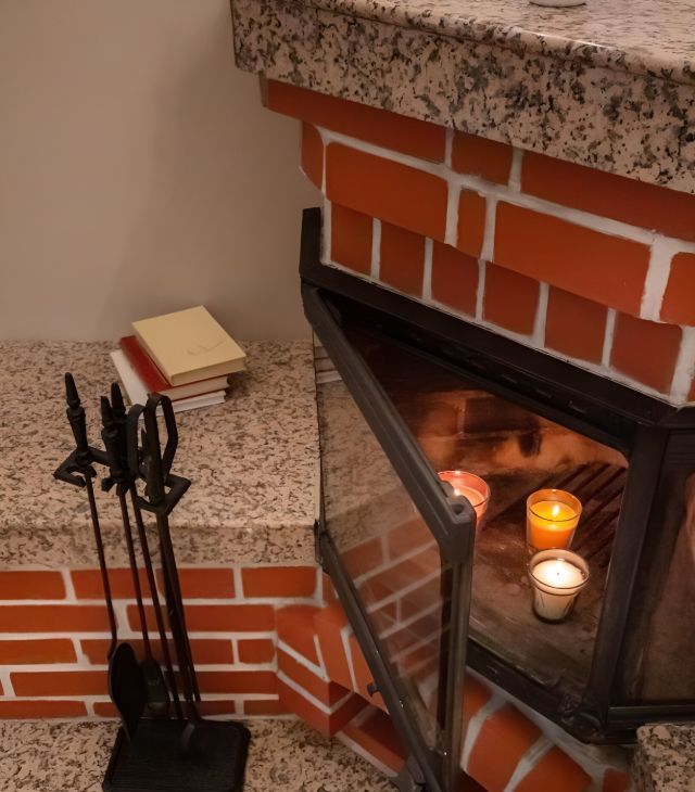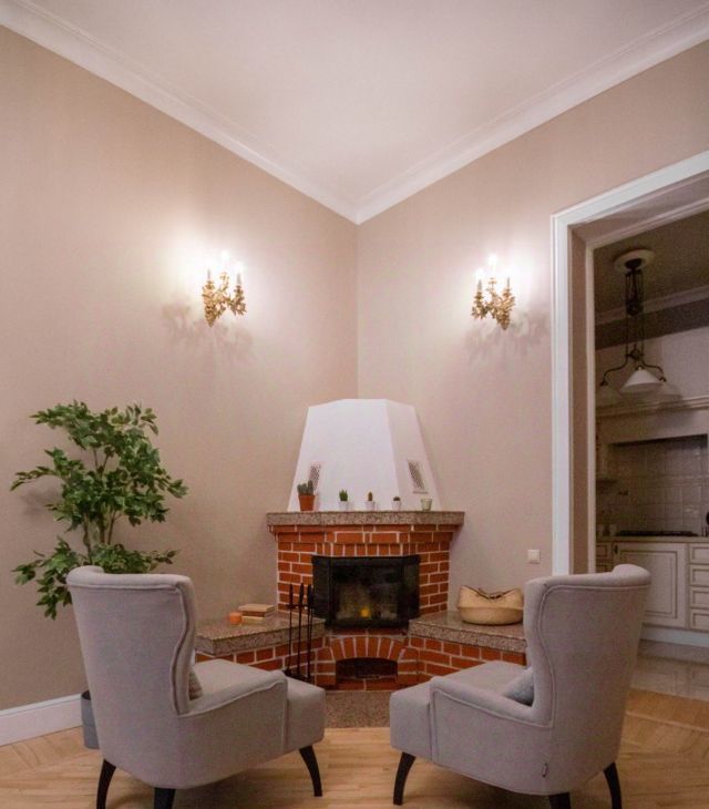 В квартире отдельная спальня с выходном на балкон, совмещённый санузел с душевой кабиной, кухонная зона со всей необходимой бытовой техникой, гостиная с искусственным камином и диваном.