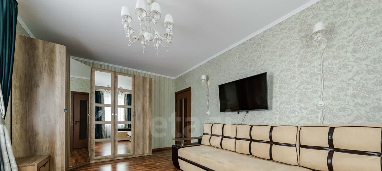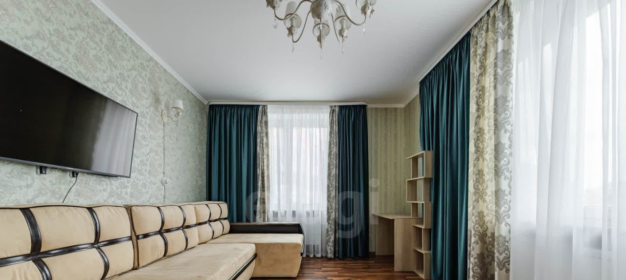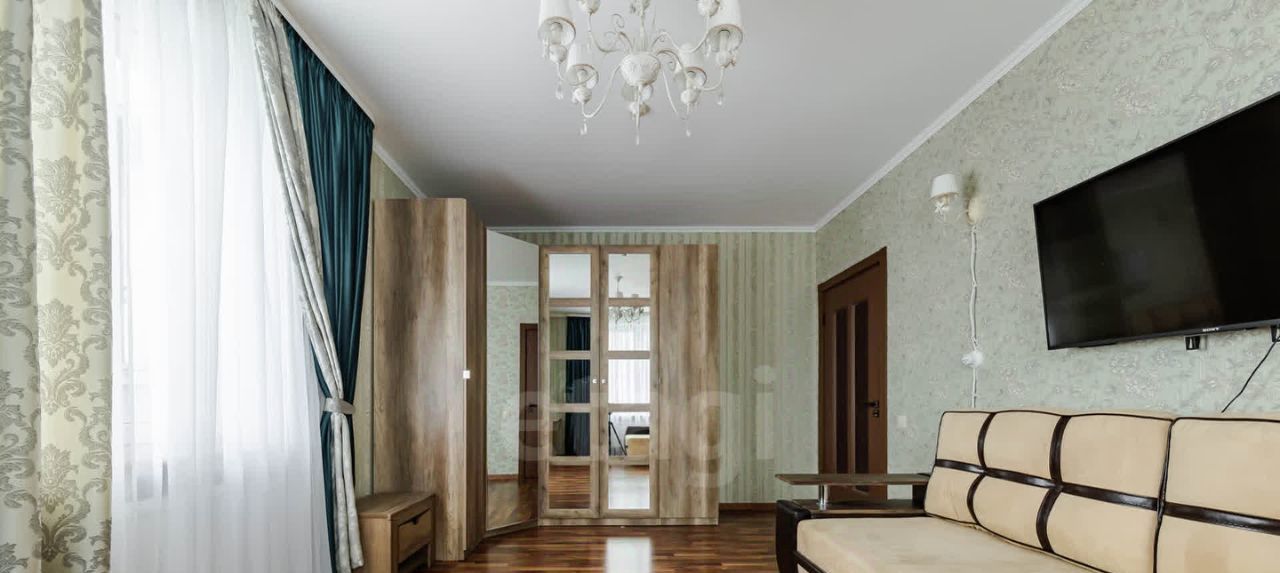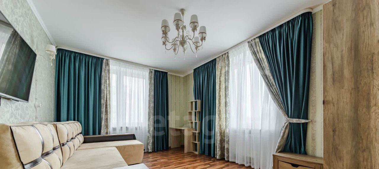 Первая просторная комната с раскладным диваном, широкоформатным телевизором, вместительным шкафом для хранения, туалетным столиком. Много света в комнате, два окна.
