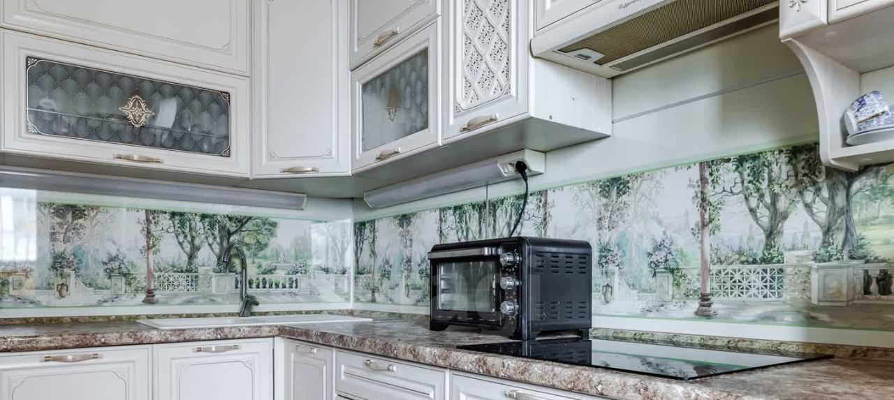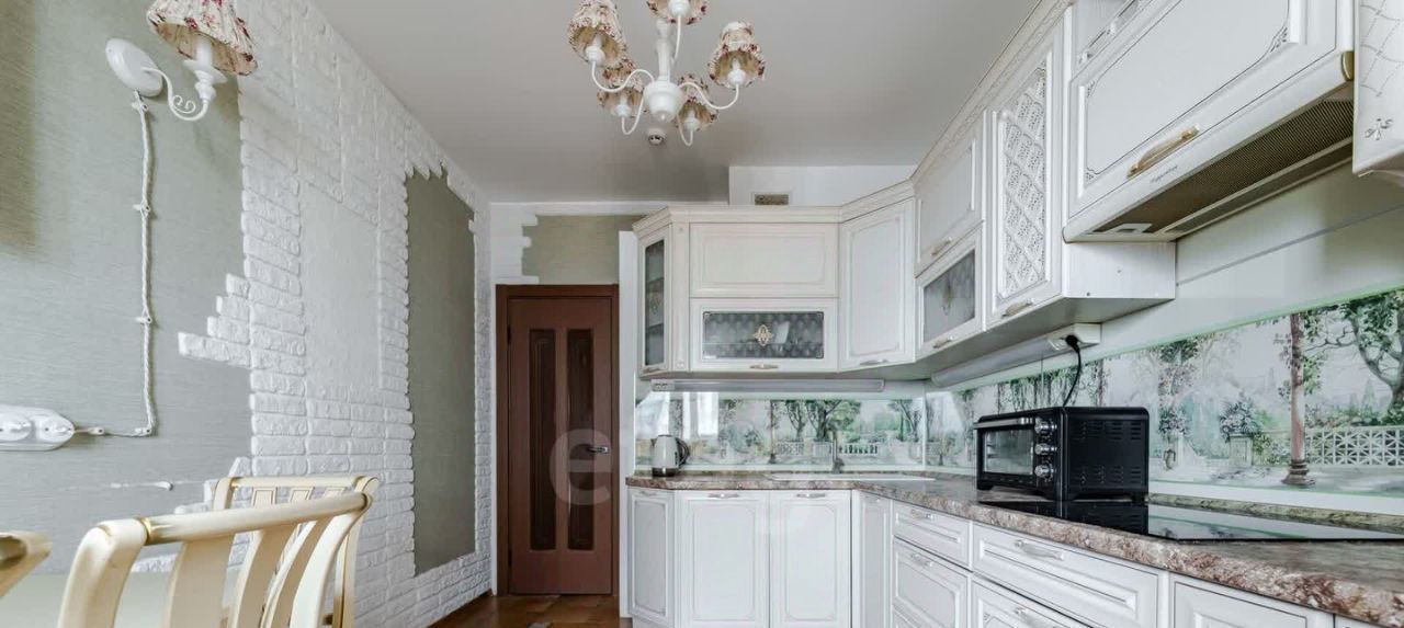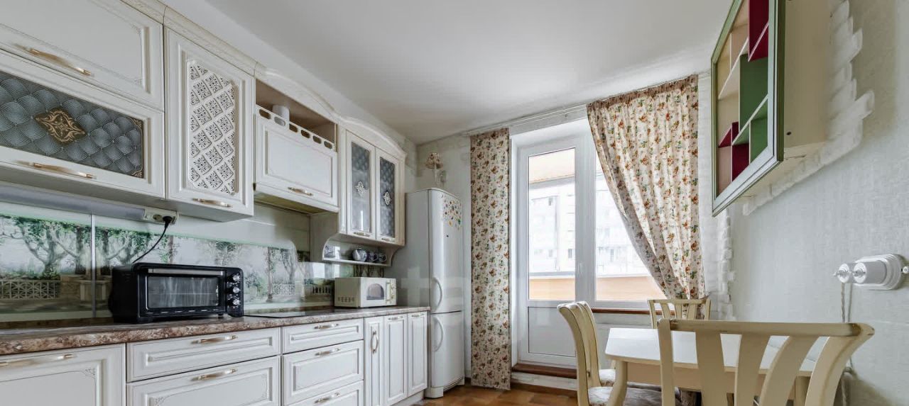 Кухня с множеством мест для хранения, техникой: варочная панель, посудомоечная машина, СВЧ, вытяжка, электрочайник, холодильник, обеденная зона и выход на первую лоджию.