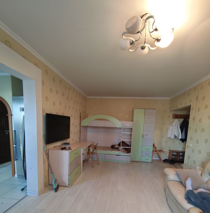 В гостиной большой диван, двухъярусная кровать, шкаф, рабочий стол, комод.
