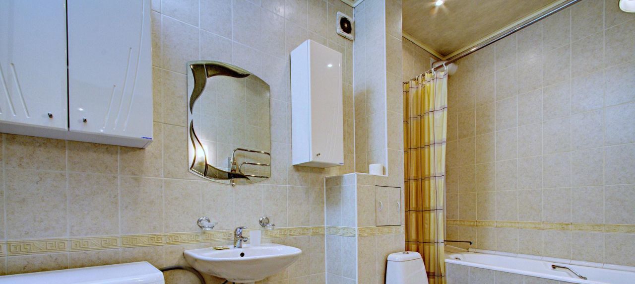 В просторной ванной комнате вы найдете раковину, туалет, ванну и стиральную машину.