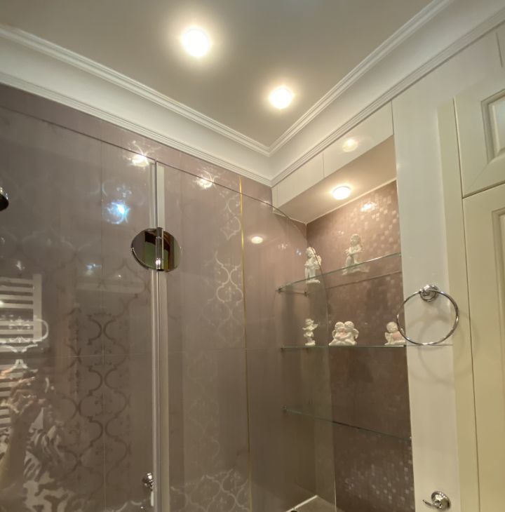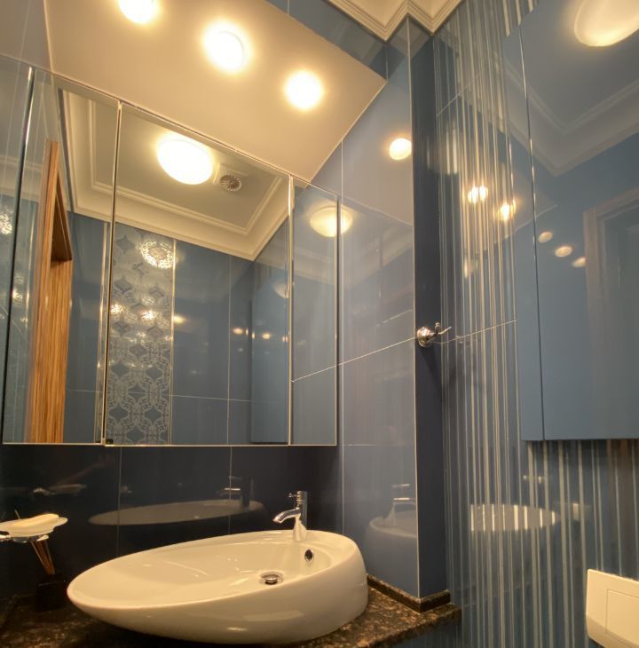 Туалет с гигиеническим душем и раковиной. Есть бойлер. Ванная комната с раздвижной стеклянной перегородкой, раковина, зеркало подсветкой, шкаф с выдвижной корзиной для грязного белья. Стиральная машина Siemens IQ-800 установлена в коридоре.