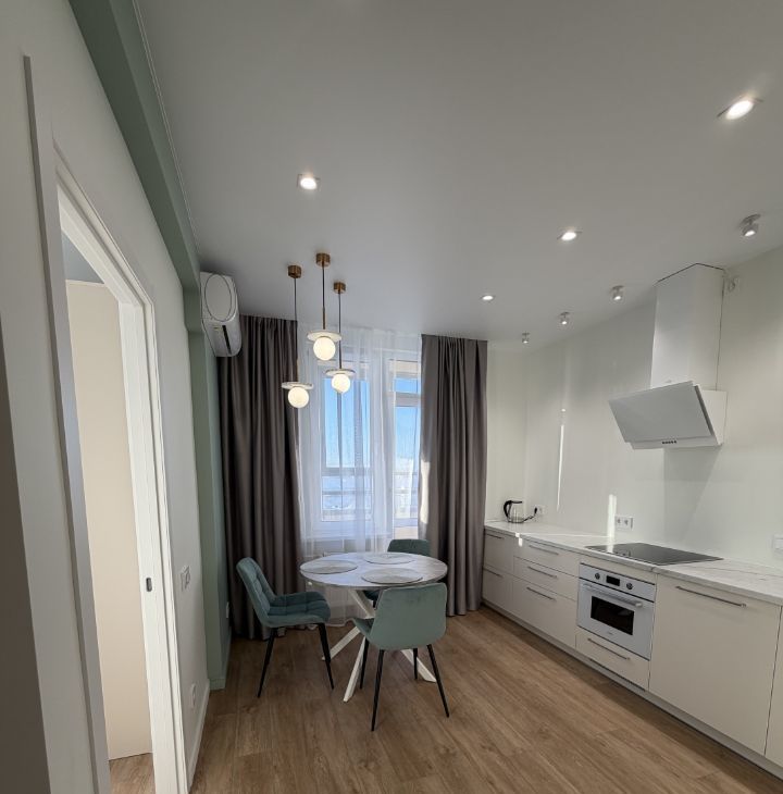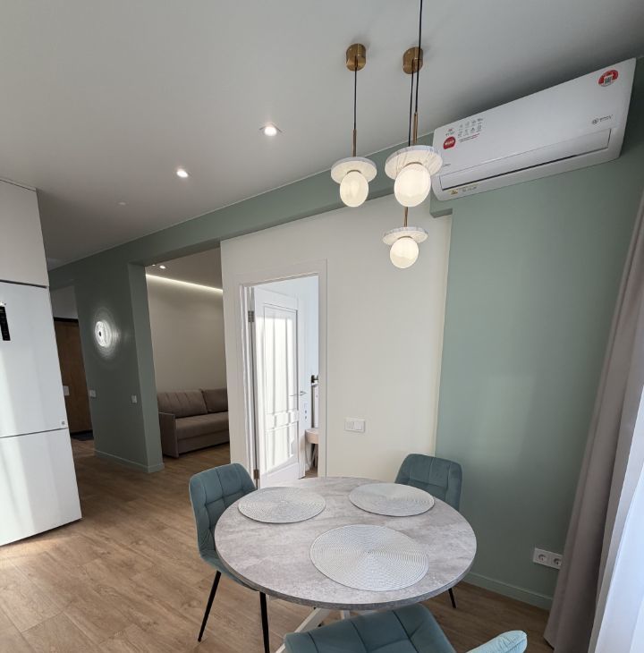 Кухня оборудована современной техникой: посудомоечная машина, свч, плита, духовой шкаф, холодильник. На кухне для удобства установлен кондиционер. Обеденный стол и стулья создают уютную атмосферу для семейных обедов.
