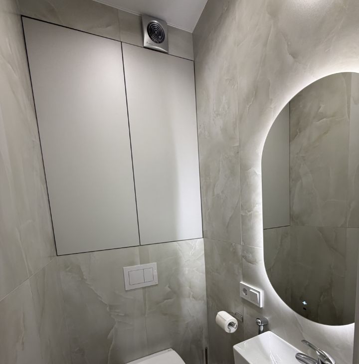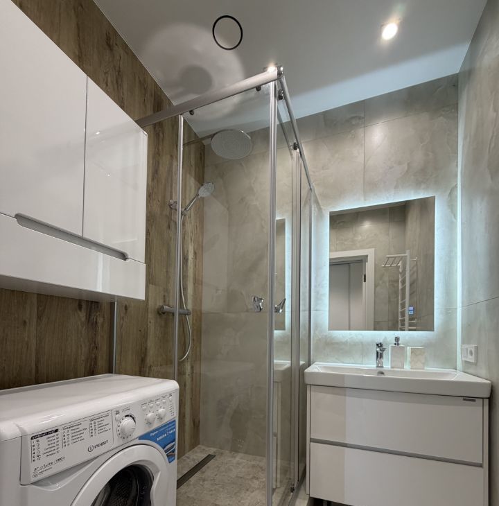 Санузел раздельный, оформлен стильной плиткой. В ванной комнате есть душевая кабина , стиральная машина, и шкаф.