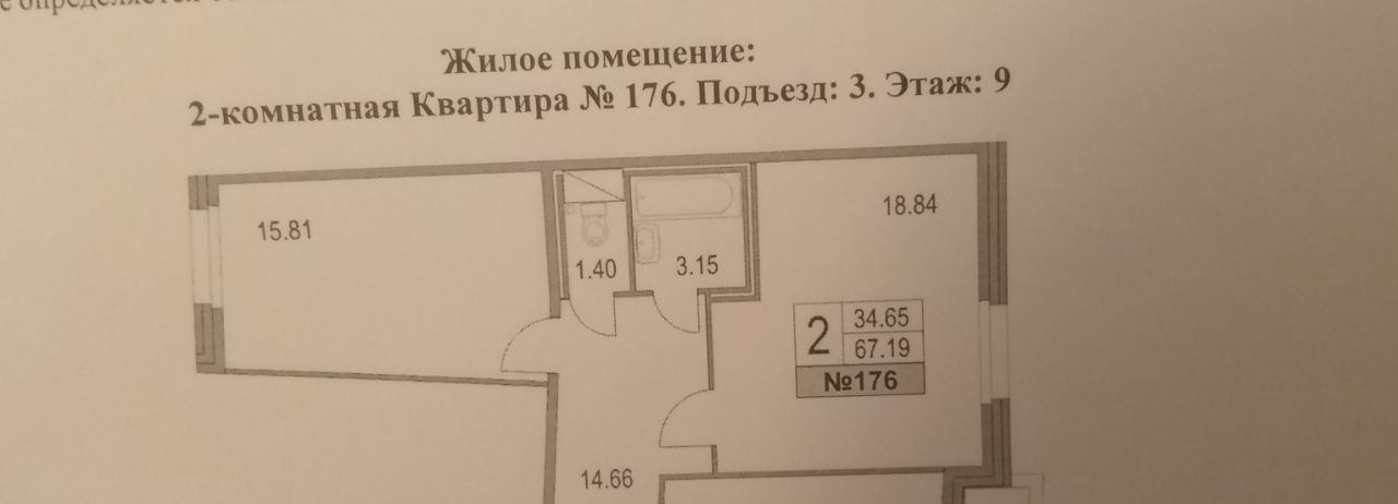 • Площадь: 67,19 м² (жилая — 34,65 м², кухня — 13,33 м²).