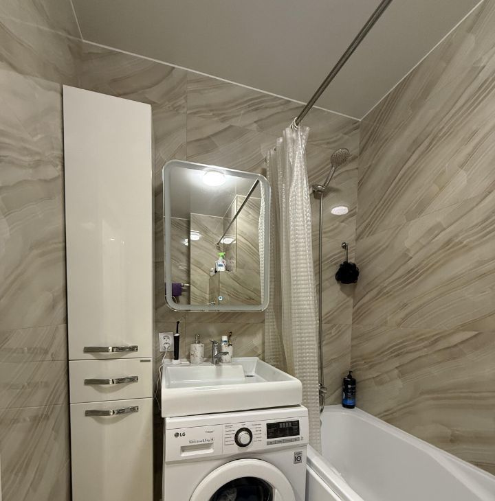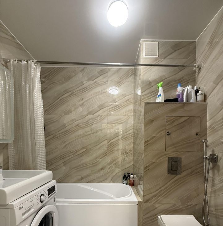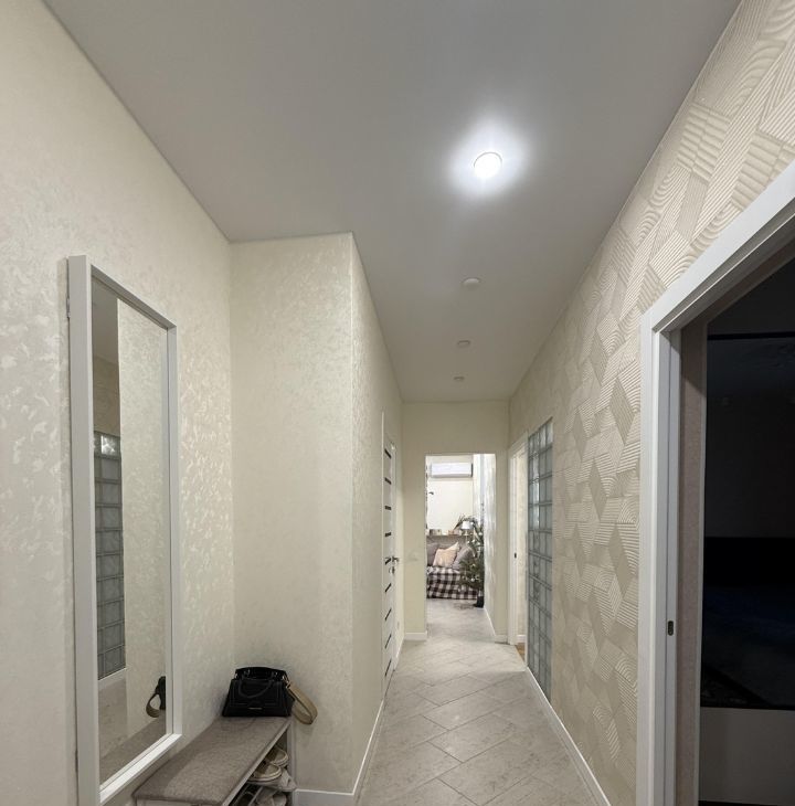 Изолированные комнаты, есть балкон, санузел совмещенный, просторный коридор. Ремонт свежий и хорошо сделан. Квартира достойно оборудована - есть вся необходимая техника, включая посудомоечную машину и кондиционер, много мест хранения.