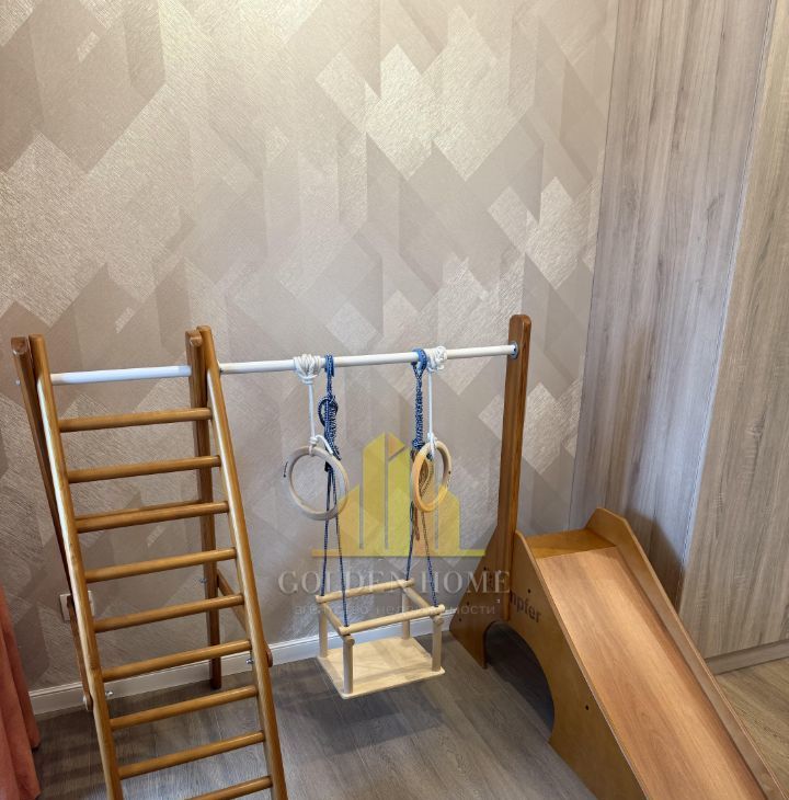 Гостиная неправильной формы. Тем не менее, комната просторная. Отдельно выделено место для детей.