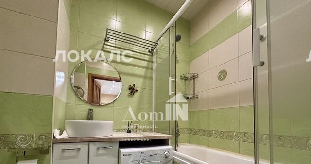 - Совмещенный санузел с ванной, стиральной машиной, раковиной и шкафчиком с зеркалом;