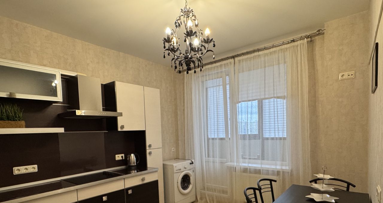 Просторная кухня площадью 15 кв. м полностью оборудована мебелью и необходимой техникой, включая холодильник и стиральную машину. Из окон открывается вид на улицу, а на балконе можно наслаждаться свежим воздухом.