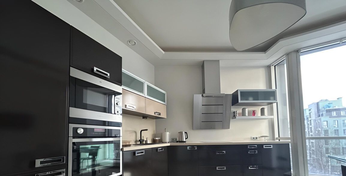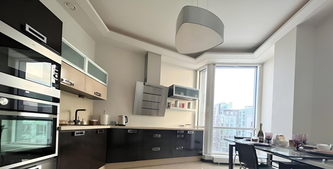 Кухня оснащена всей бытовой техникой AEG: встроенный холодильник, варочная поверхность, вытяжка, посудомоечная машина, духовой шкаф, микроволновая печь. Раскладной большой стеклянный стол, стулья, посуда.
