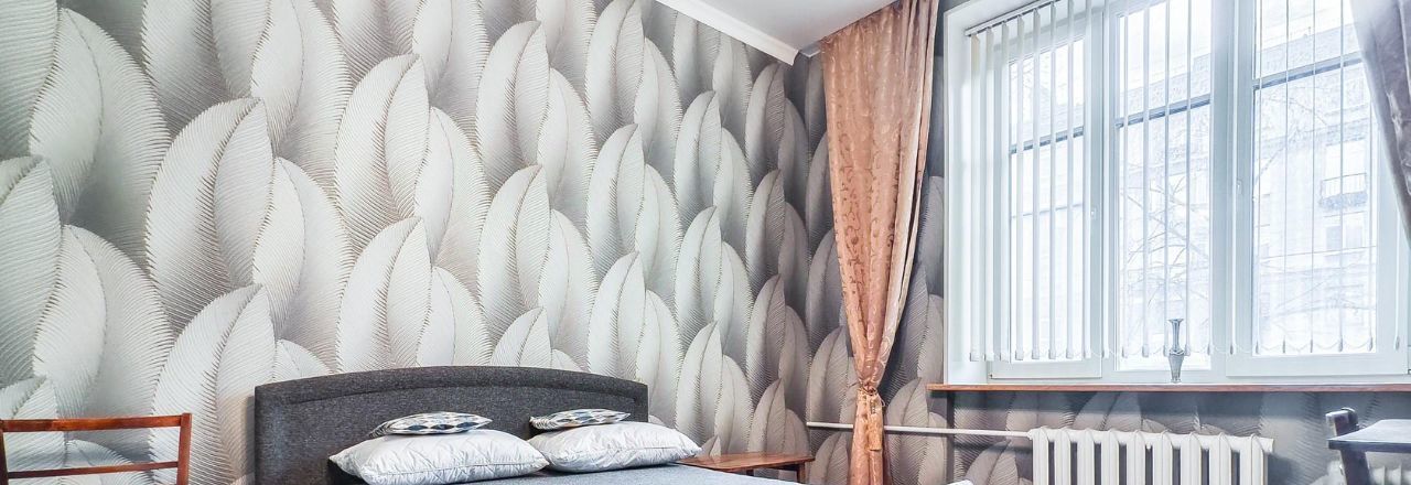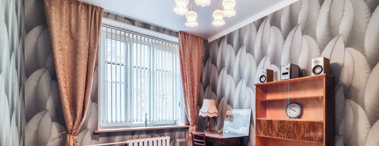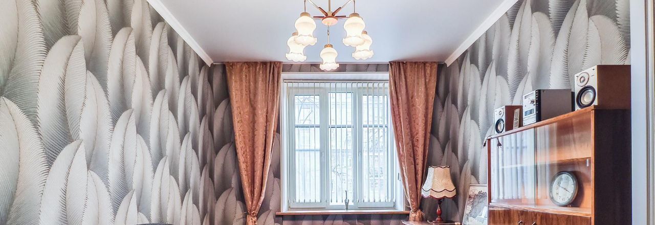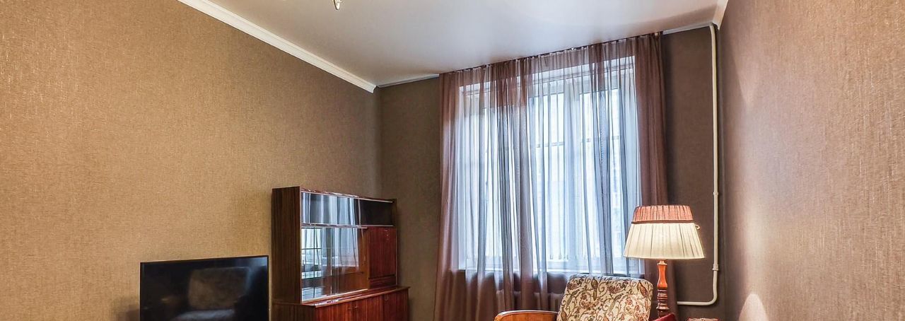 Две изолированные комнаты, одна из которых спальня, а вторая - гостиная. В спальне расположилась удобная двуспальная тахта с изголовьем и подъёмным механизмом, есть письменный стол и стеллаж. В гостиной - диван-еврокнижка, кресло, торшер, современный телевизор, сервант и платяной шкаф. В комнатах и на кухне на окнах установлены вертикальные жалюзи, в жилых комнатах дополнительно имеются шторы.