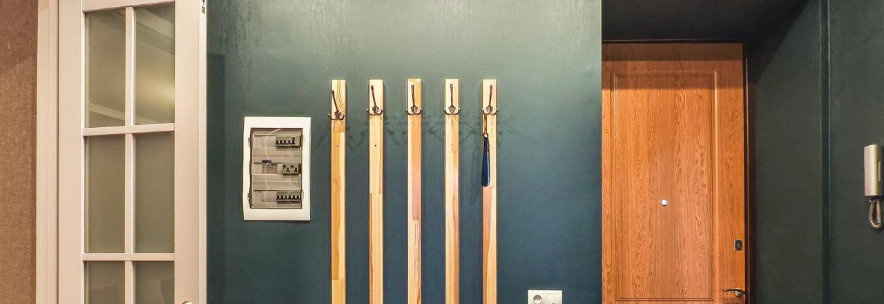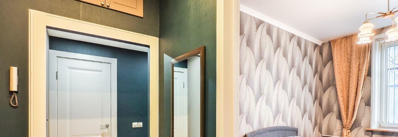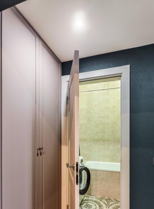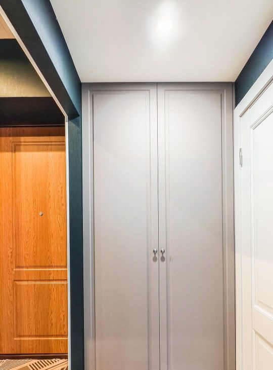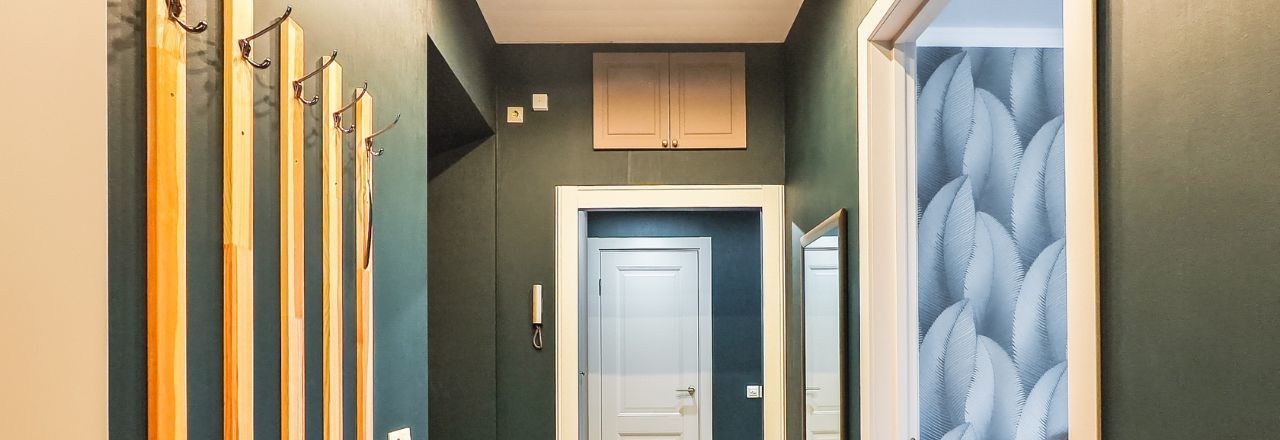 В коридоре есть встроенный шкаф, антресоль, а также зеркало, пуф и вешалки.