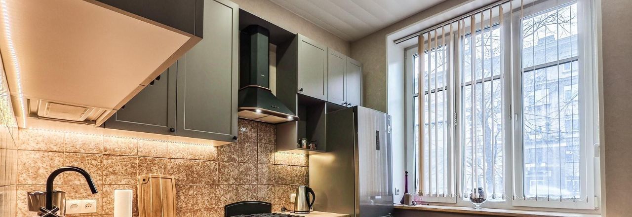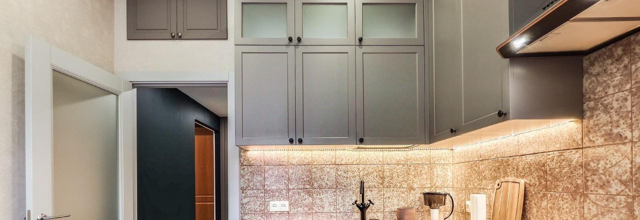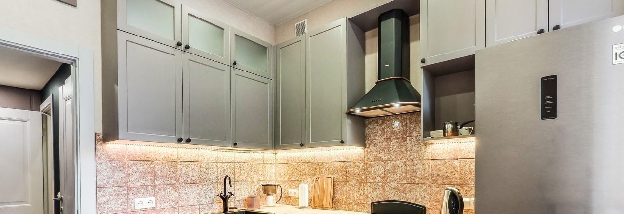 На кухне установлен вместительный угловой гарнитур вдоль двух стен, есть подсветка рабочей зоны кухни.