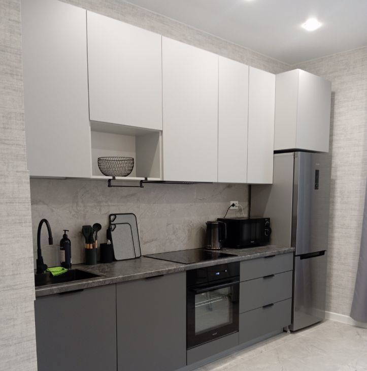 Кухня оборудована всем необходимым: встроенная плита, духовой шкаф, холодильник и микроволновая печь. В гостиной установлен комфортный диван и широкоформатный телевизор. В спальне большая кровать и выход на просторный балкон.